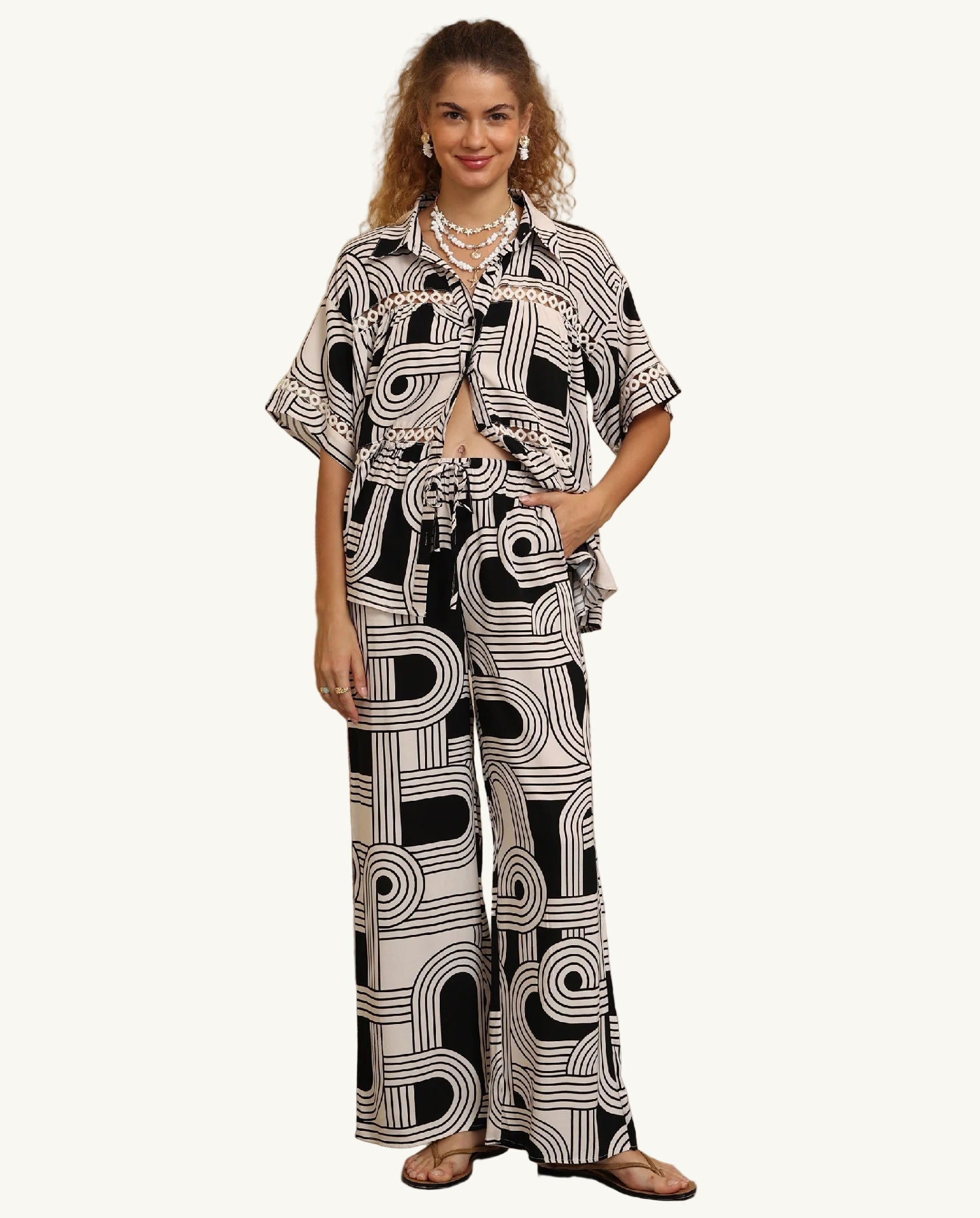 The Costanza Shirt by Iris Maxi is a monchrome marvel that will go with everything in your wardrobe. The shape is relaxed, allowing with graphic art deco print to really pop! And is beautifully complemented with see through panels featuring appliqued rings.