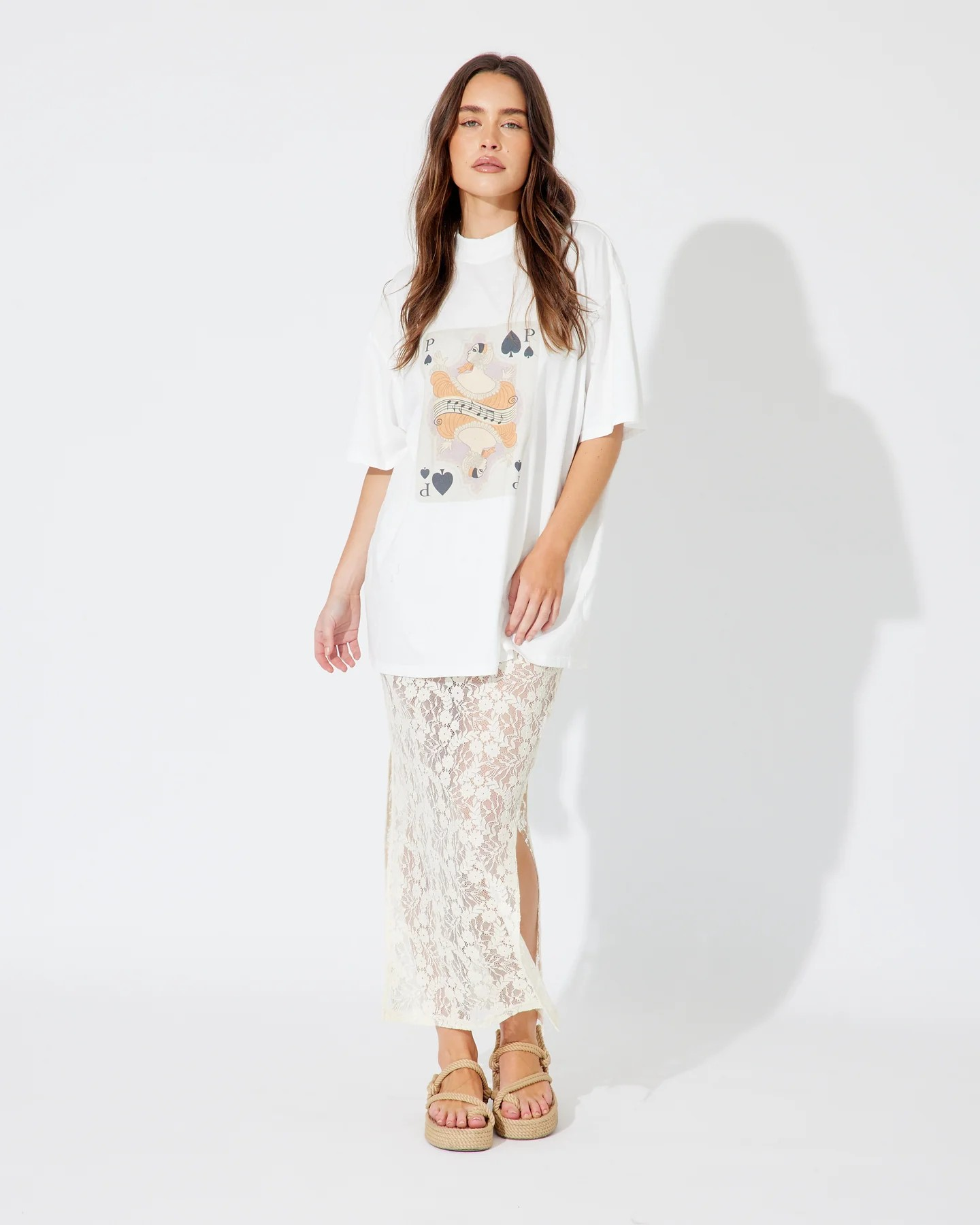 Get ready to turn heads with the Chloe Lace Skirt by Peaches & Parla! This on-trend skirt features a delicate lace design and no lining making it fully sheer. However, the way to wear this, this season, it with a long length top such as an oversized T-shirt or blazer. The resulting look is super chic!