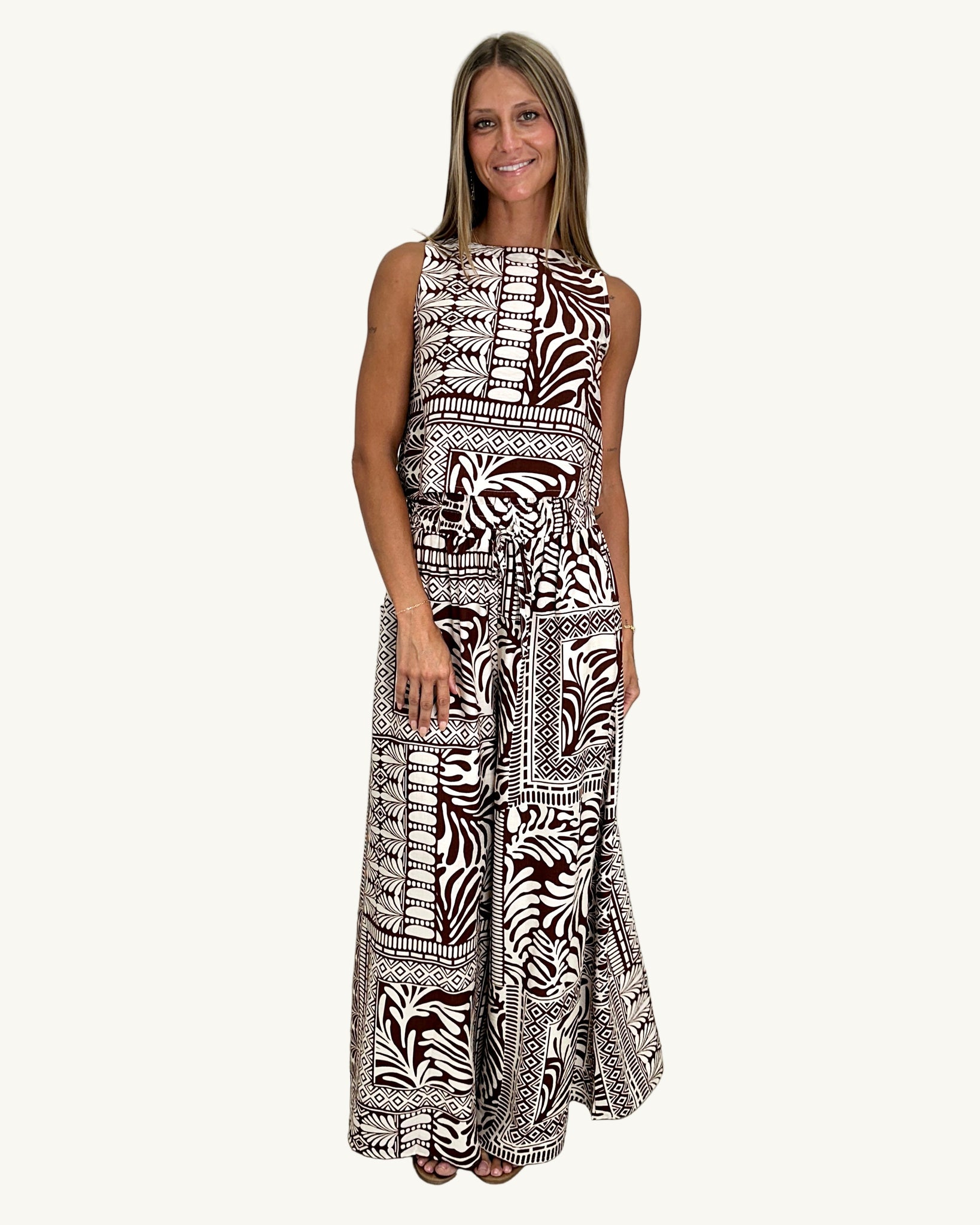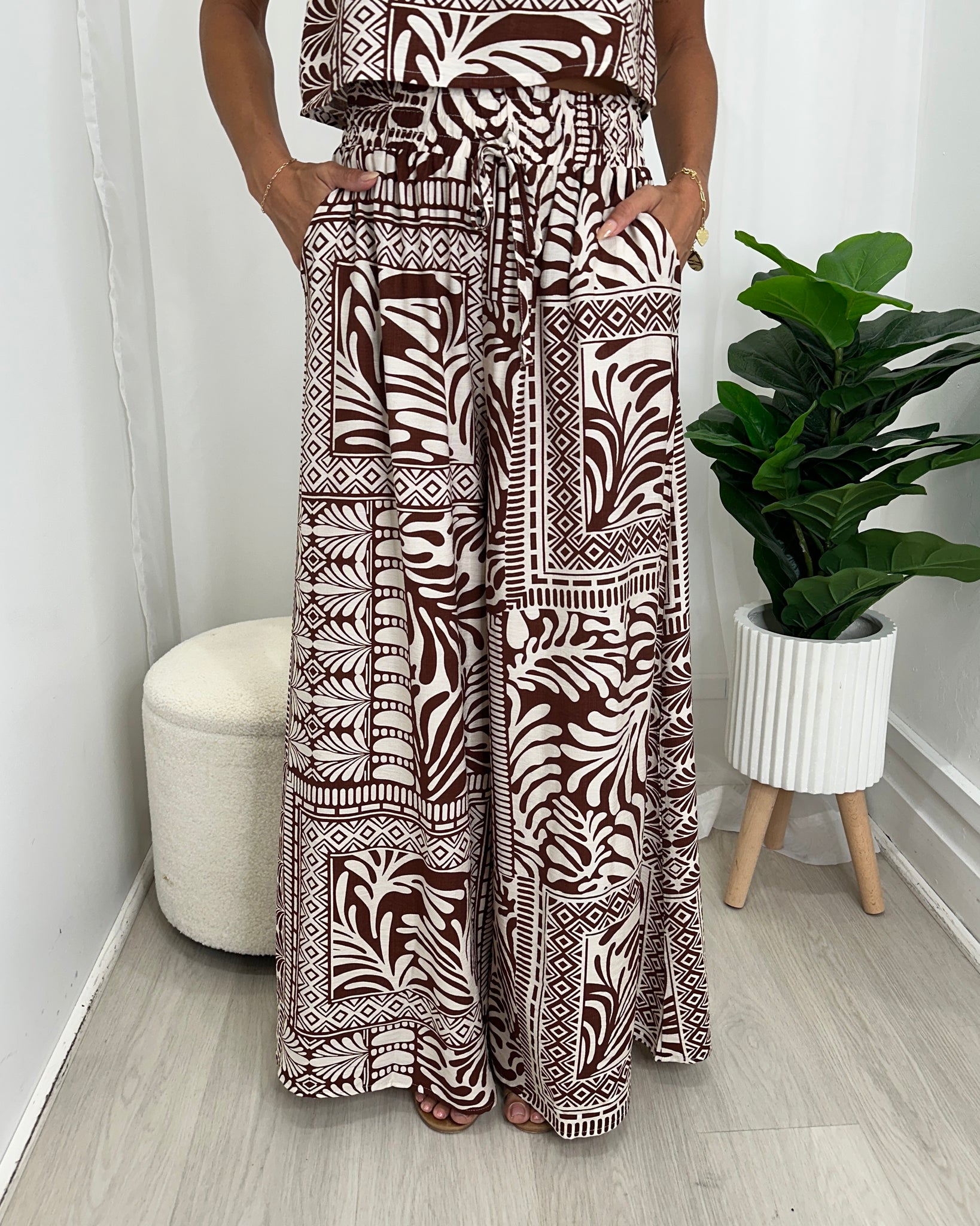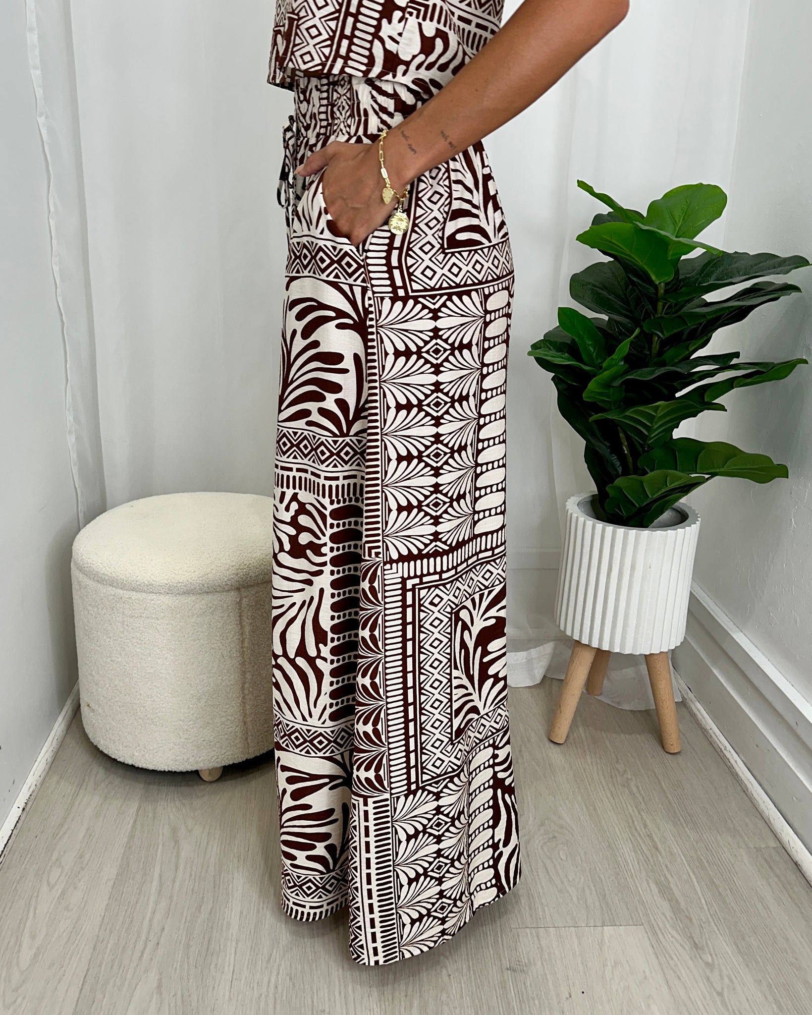 Make a bold, effortless statement with the Dana Pants by Ava — a striking style that blends relaxed comfort with elevated, modern style. Designed in a rich chocolate and cream tribal-inspired print, these pants offers impact without sacrificing ease.