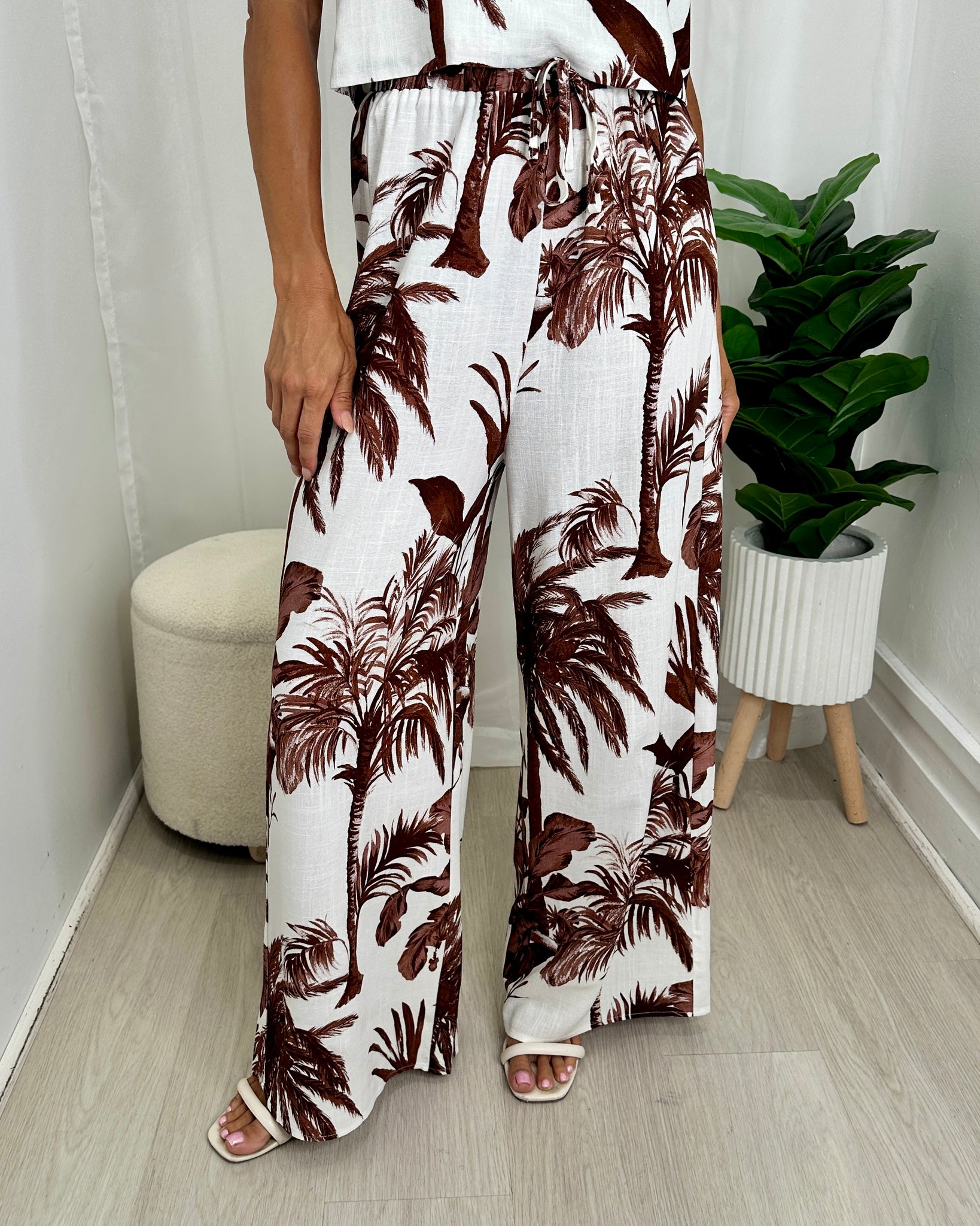 The Ipanema Pants by White Closet deliver effortless elegance with a relaxed yet polished feel. Featuring the same striking palm print in deep chocolate hues, these pants are designed with a flattering high waist and fluid wide-leg silhouette that moves beautifully with every step.