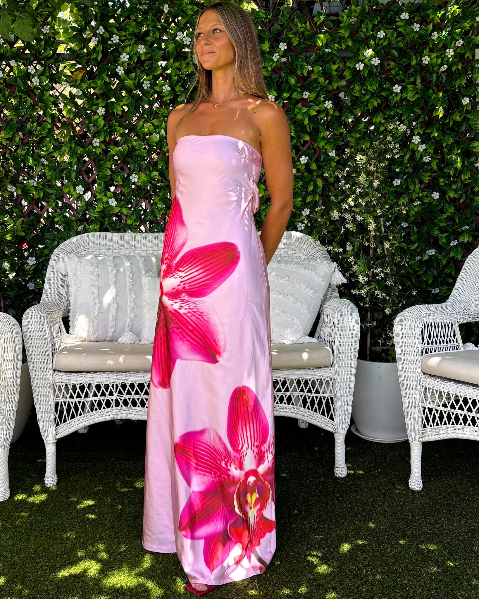 Make an unforgettable entrance in the Celeste Maxi Dress — a striking, feminine silhouette designed to turn heads. Crafted in a soft blush-pink satin with a glossy, luminous finish, this gown features an eye-catching oversized orchid print that blooms elegantly across the skirt for a bold, modern statement.