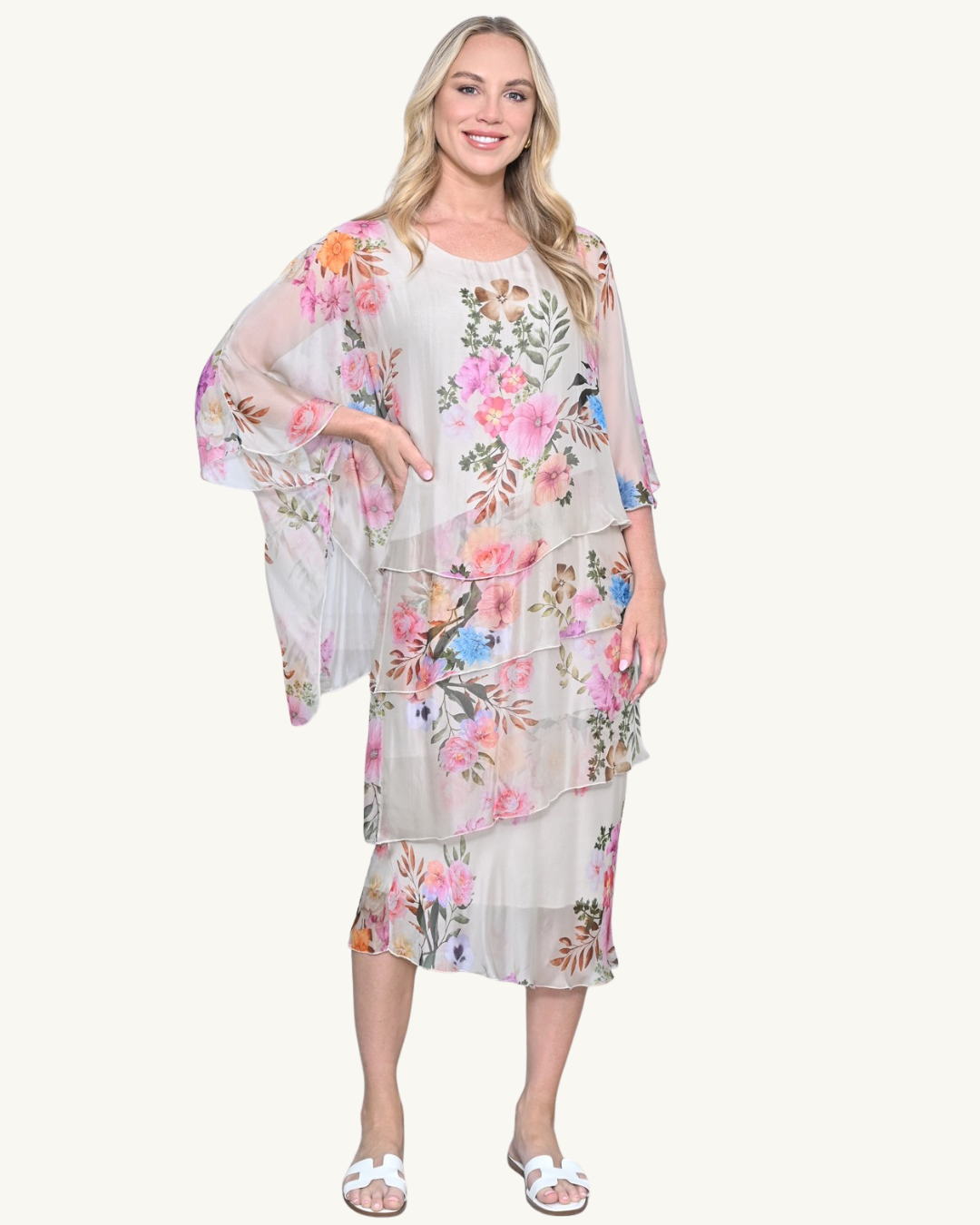 Light, floaty and beautifully feminine, the Fleurs Silk Dress by AE Luxe  is designed for effortless elegance. Crafted from a soft, sheer silk blend with a cascade of layered panels, it drapes gracefully over the body while showcasing a vibrant floral print that feels timeless and uplifting.