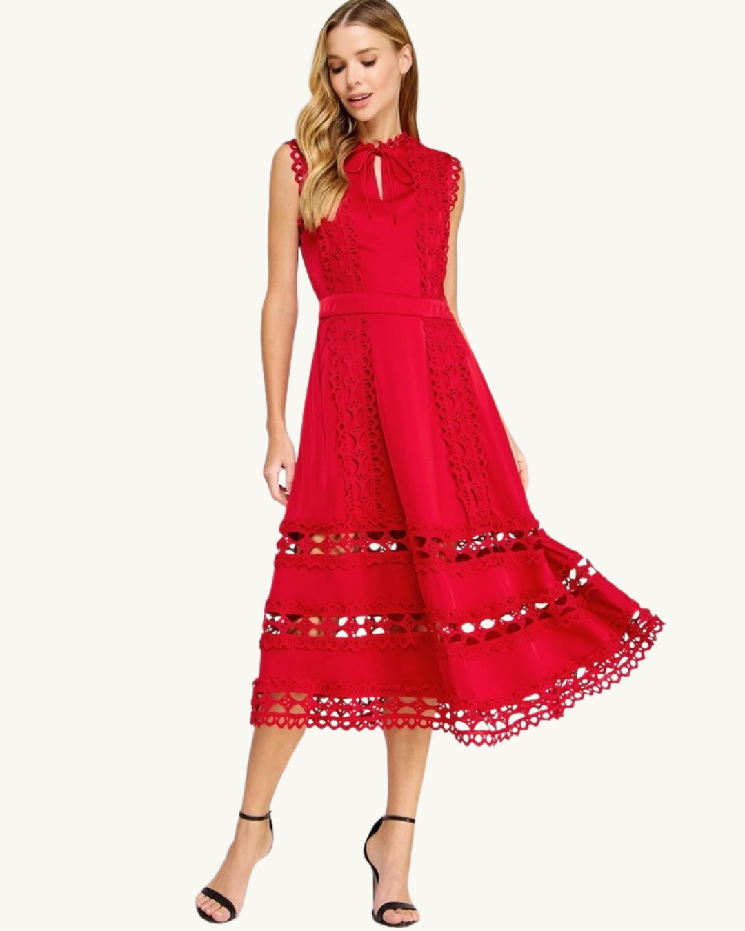 Featuring intricate lace paneling, a flattering fitted bodice and a soft A-line midi skirt, the silhouette creates graceful movement with every step. The neckline is finished with a delicate tie and subtle ruffle trim, adding charm and refinement to the overall look.