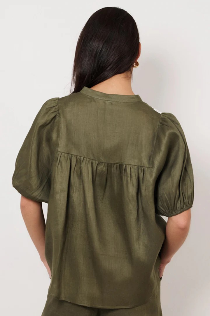 The Palmer Embroidered Boho Top by Adorne is crafted from 100% linen with floral embroidery. Designed with puff sleeves and elastic cuffs, a mandarin collar, and an open V-neckline, it features a button-down front with self-covered buttons.