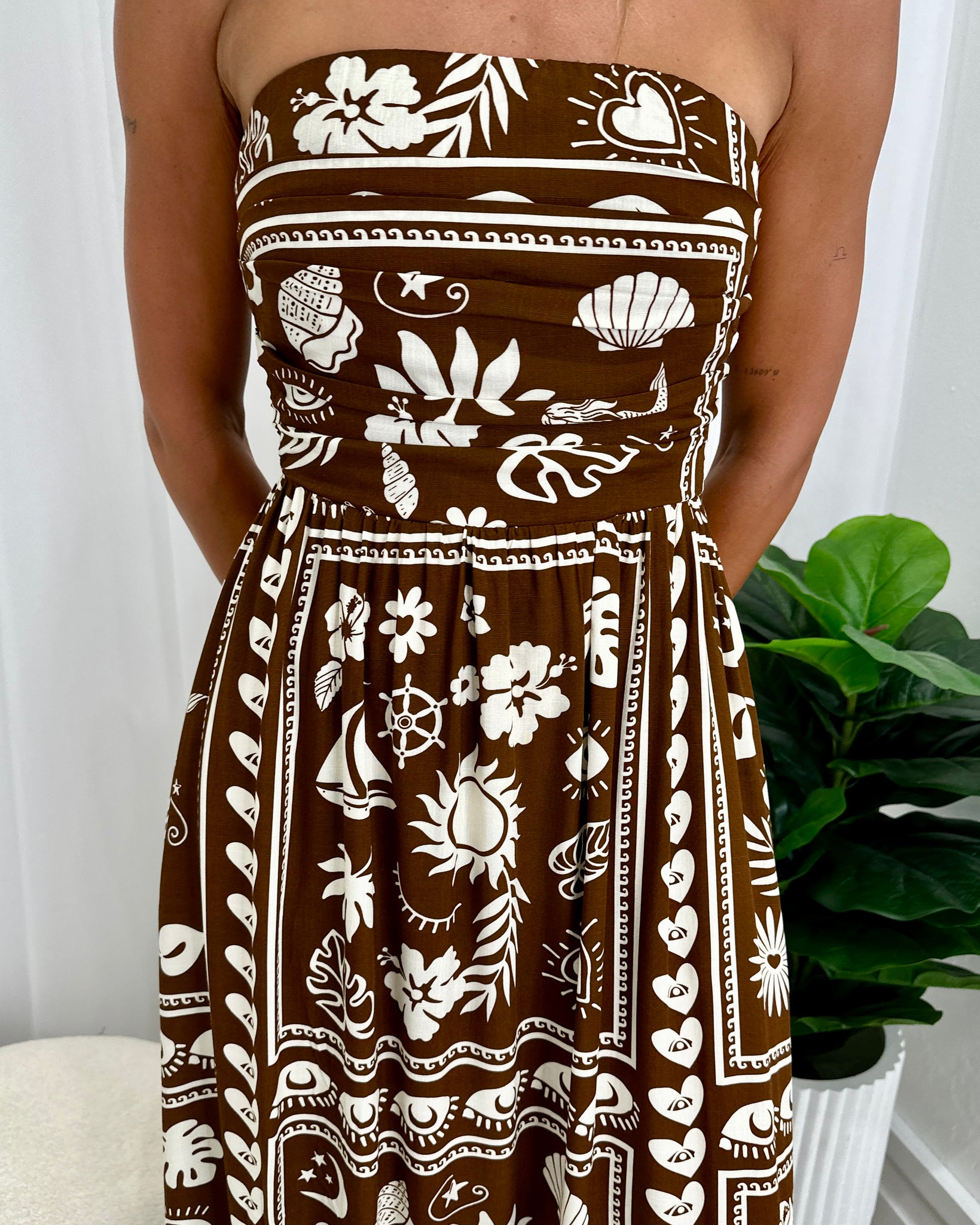 The Pete Midi Dress by Pink Diamond is a breezy, statement-making summer dress featuring a rich chocolate base and bold cream island-inspired motifs. With its easy strapless neckline, soft drape, and flowy silhouette, it’s the perfect throw-on piece for holidays, long lunches, or warm days when you want effortless style with maximum impact.
