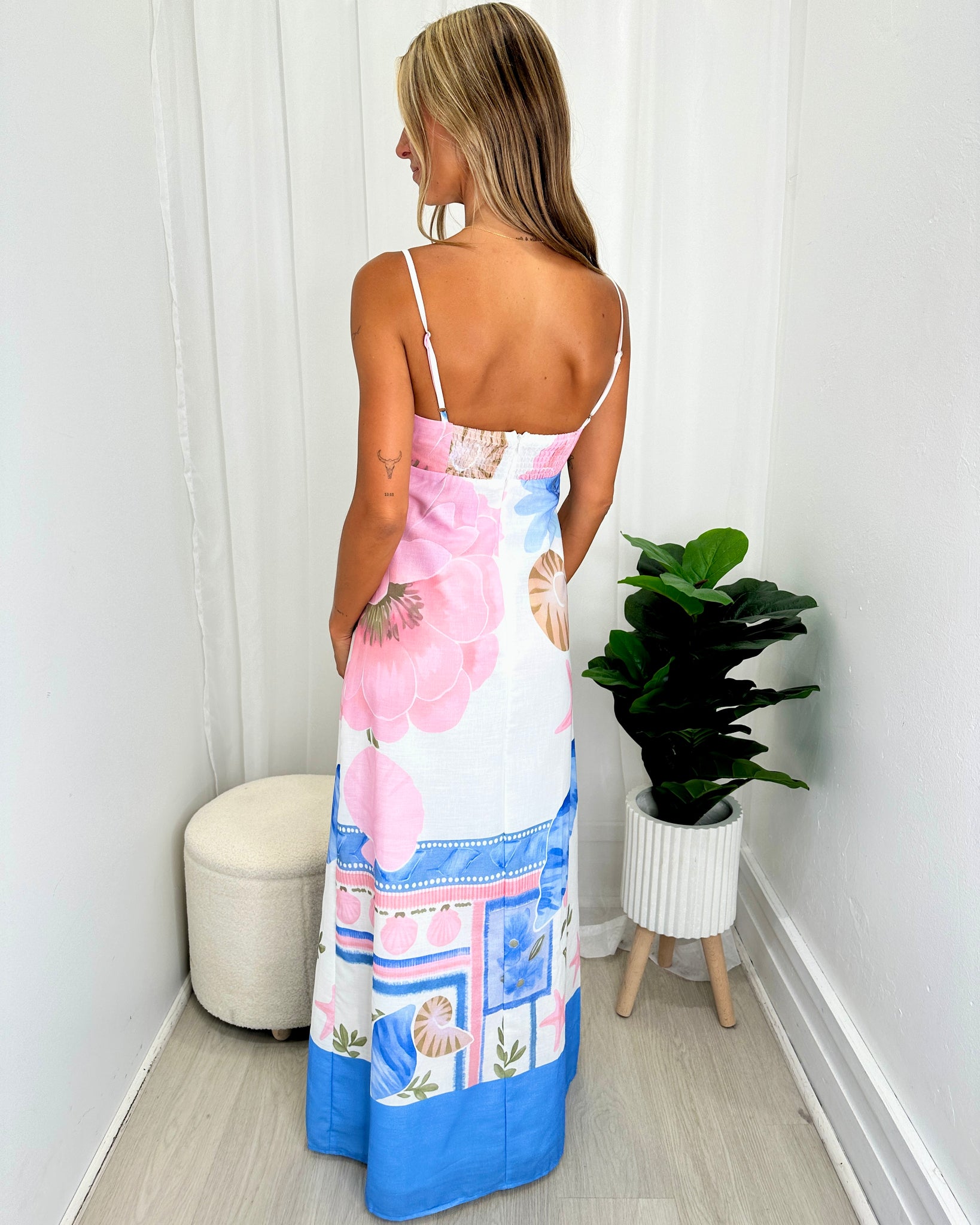The Ty Maxi Dress by Indikah is a dreamy coastal-inspired piece perfect for summer days, holidays, and long lunches by the water. Its soft blue, pink, and sand-toned print gives it a fresh, airy feel, while the straight neckline and slim straps keep the silhouette modern and effortless.