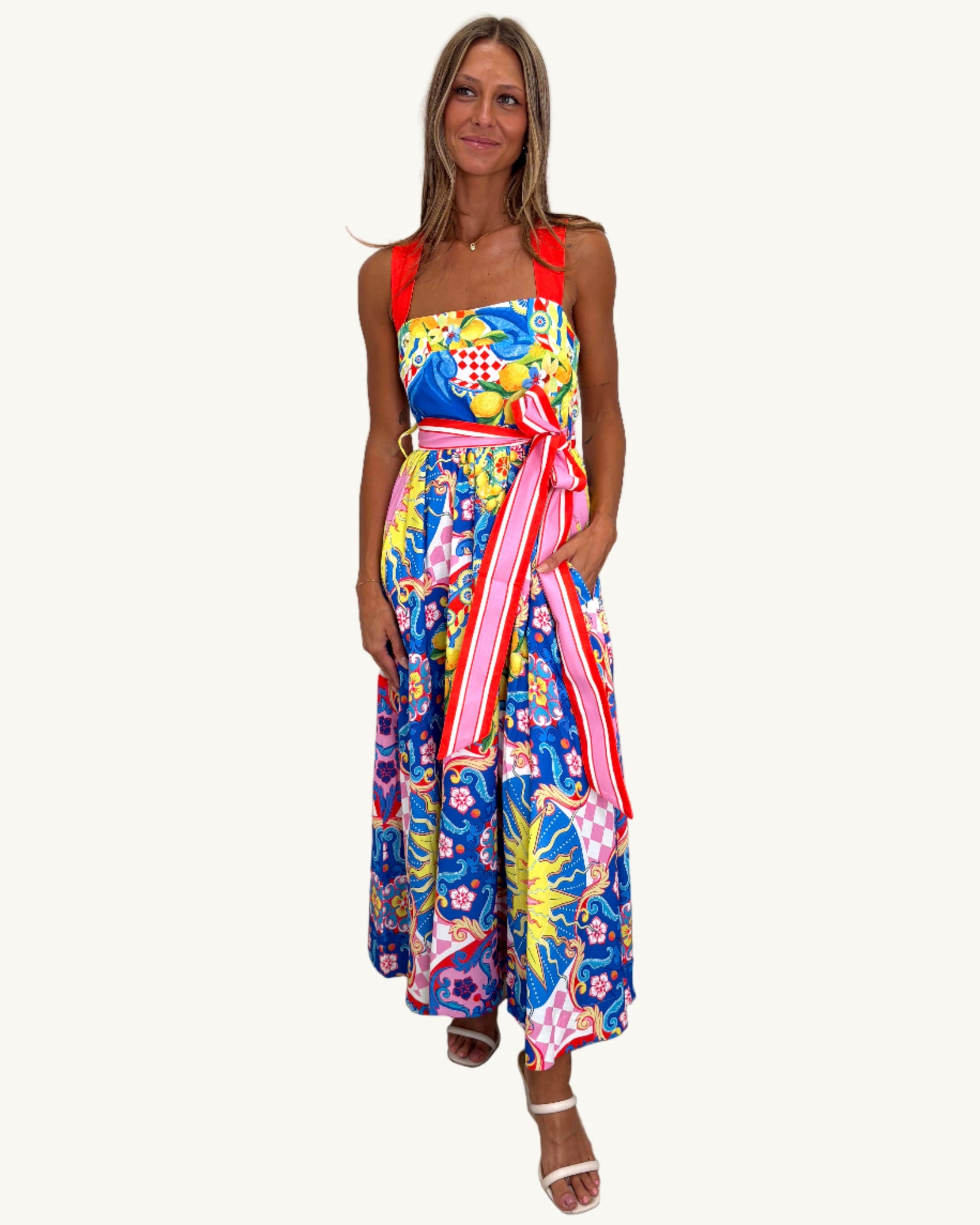 Step into sunshine with the breathtaking Sicily Maxi Dress by Mia Milani — a vibrant, resort-inspired statement piece that captures the magic of Mediterranean summers. Designed in a striking mosaic of colour, pattern, and movement, this dress is all about effortless elegance with a joyful twist. Perfect for getaways, long lunches, and summer events.