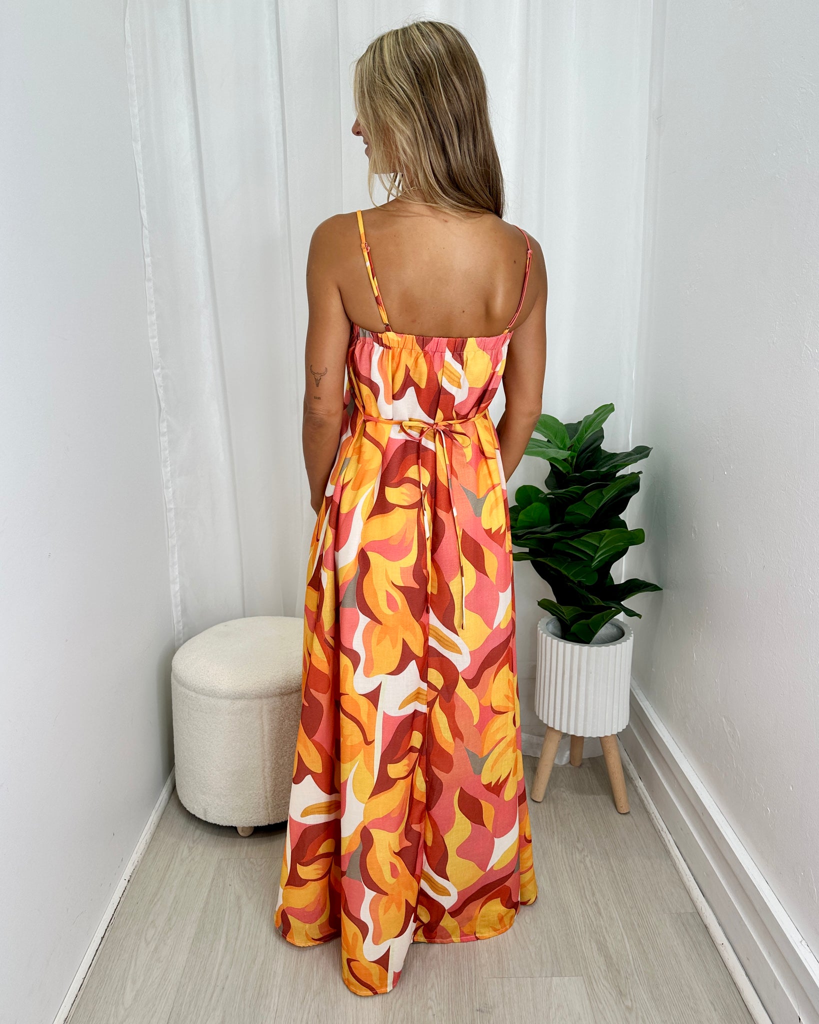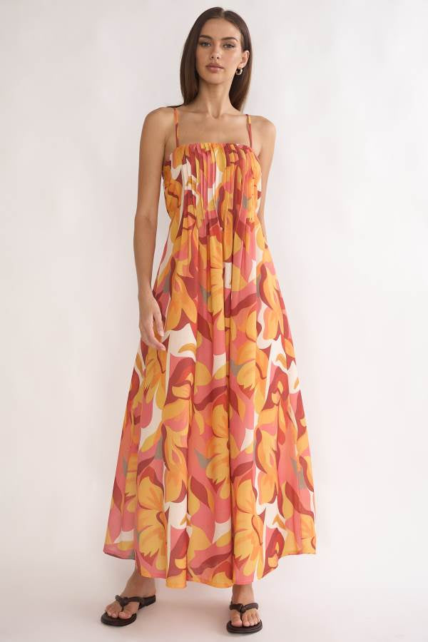 The Sunshine Maxi Dress by Indikah is a vibrant summer style that celebrates of colour and effortless summer style. Designed with delicate straps and a softly gathered bodice, it falls into a flowing silhouette that moves beautifully with every step. The warm, retro-inspired print brings a bold yet refined statement, perfect for sun-drenched days, long lunches, and balmy evenings away.