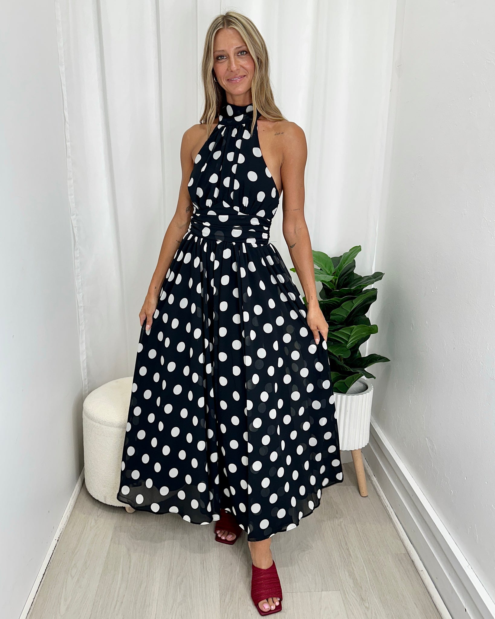 The Tommy Maxi Dress by Pink Diamond is a classic showstopper with timeless appeal. Designed in a striking black base with bold white polka dots, this elegant maxi features a flattering halter neckline and a beautifully cinched waist that flows into a soft, feminine skirt. Effortless yet refined, it’s the perfect piece for festive occasions, long lunches, or evenings that call for a little extra polish.