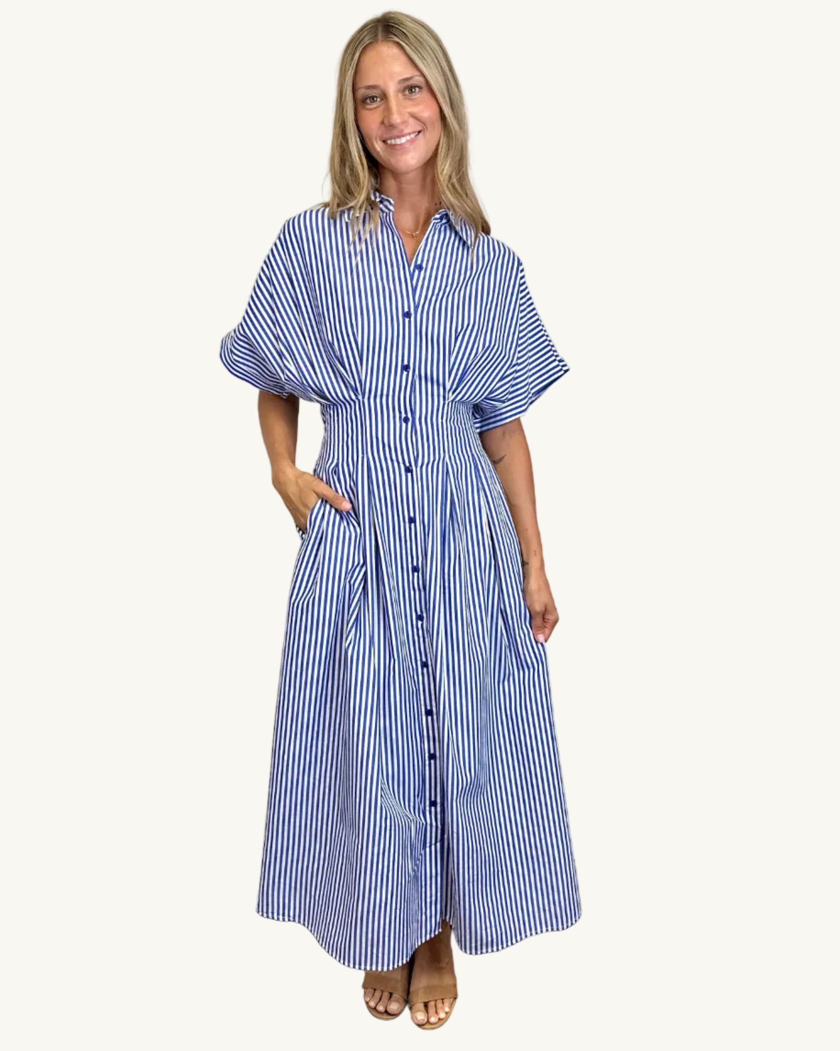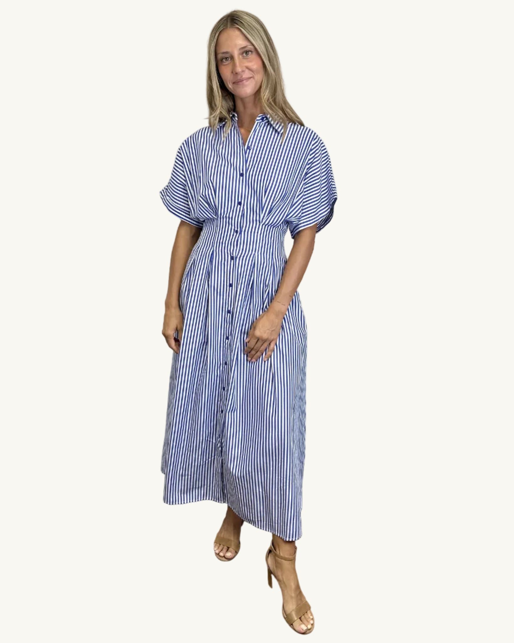 Classic shirting, reimagined. The Addison Striped Midi Dress by Boho Australia brings effortless polish to everyday dressing with its timeless blue-and-white stripe and softly structured silhouette. Designed with a relaxed bodice and cinched waist, it creates shape without compromising on comfort — the kind of piece you’ll reach for on repeat.
