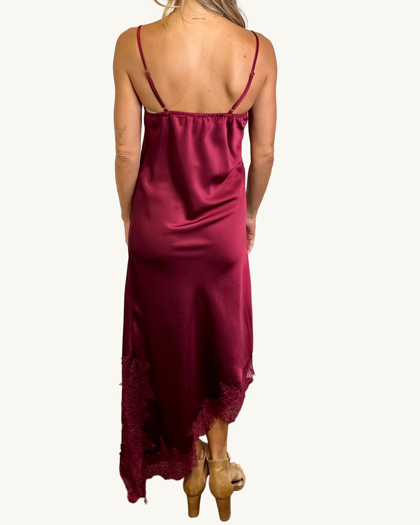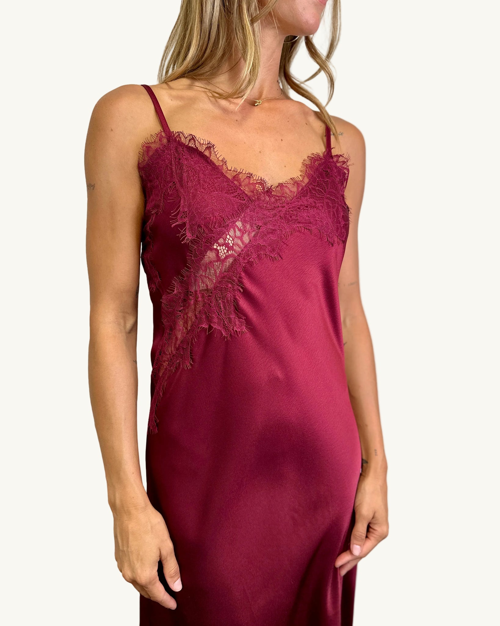 A true statement piece in the richest wine hue, this silky Amelia Satin Slip Dress by White Closet is where effortless elegance meets a touch of after-dark allure. Cut on the bias for a beautifully fluid drape, it skims the body in all the right places while delicate lace detailing adds that romantic, feminine edge.