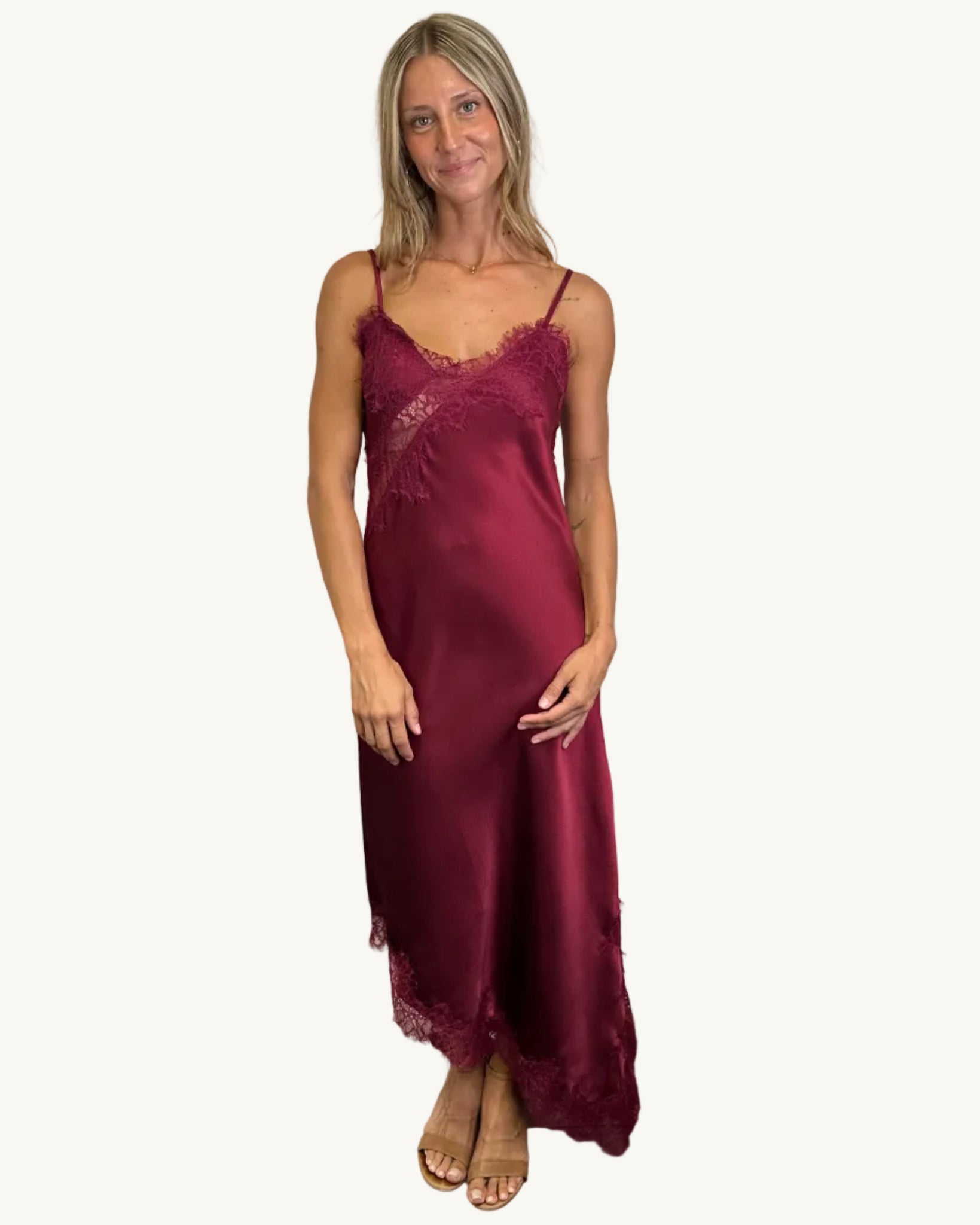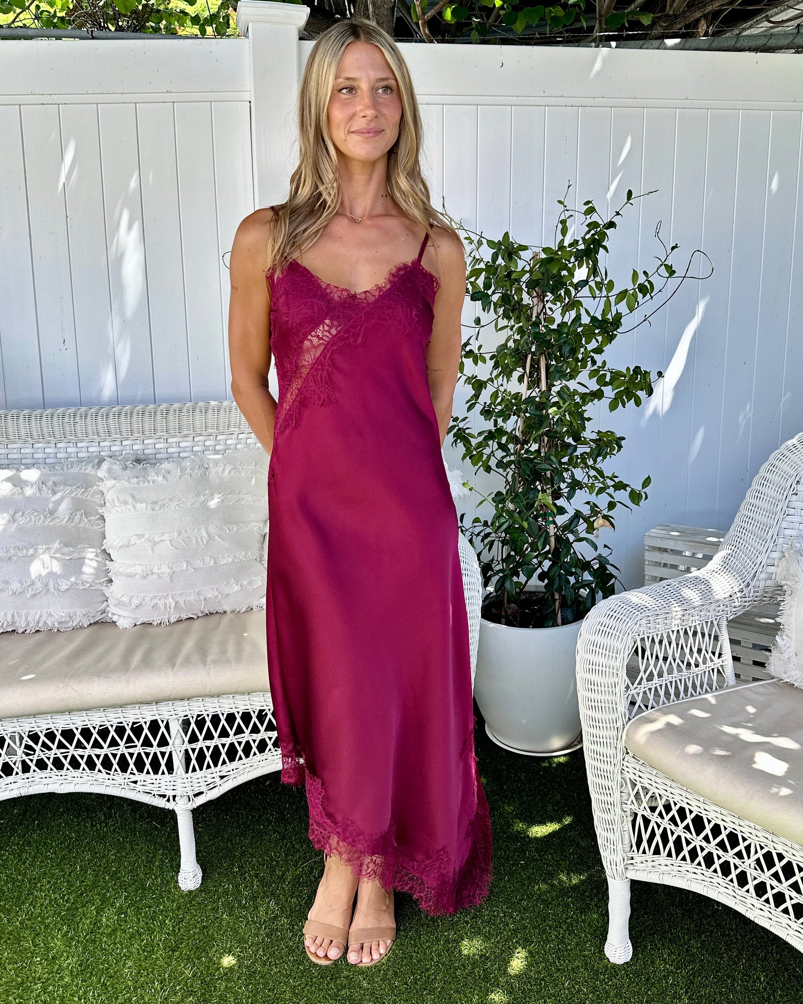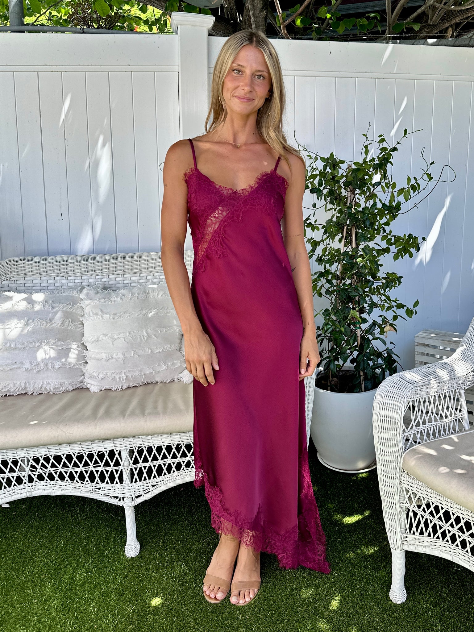 From long lunches to late-night celebrations, this is the dress that does it all. The deep berry tone feels luxe and timeless, while the lace trim along the neckline and hem elevates it beyond the everyday. Just add a barely-there heel and gold jewellery for an instantly polished look.