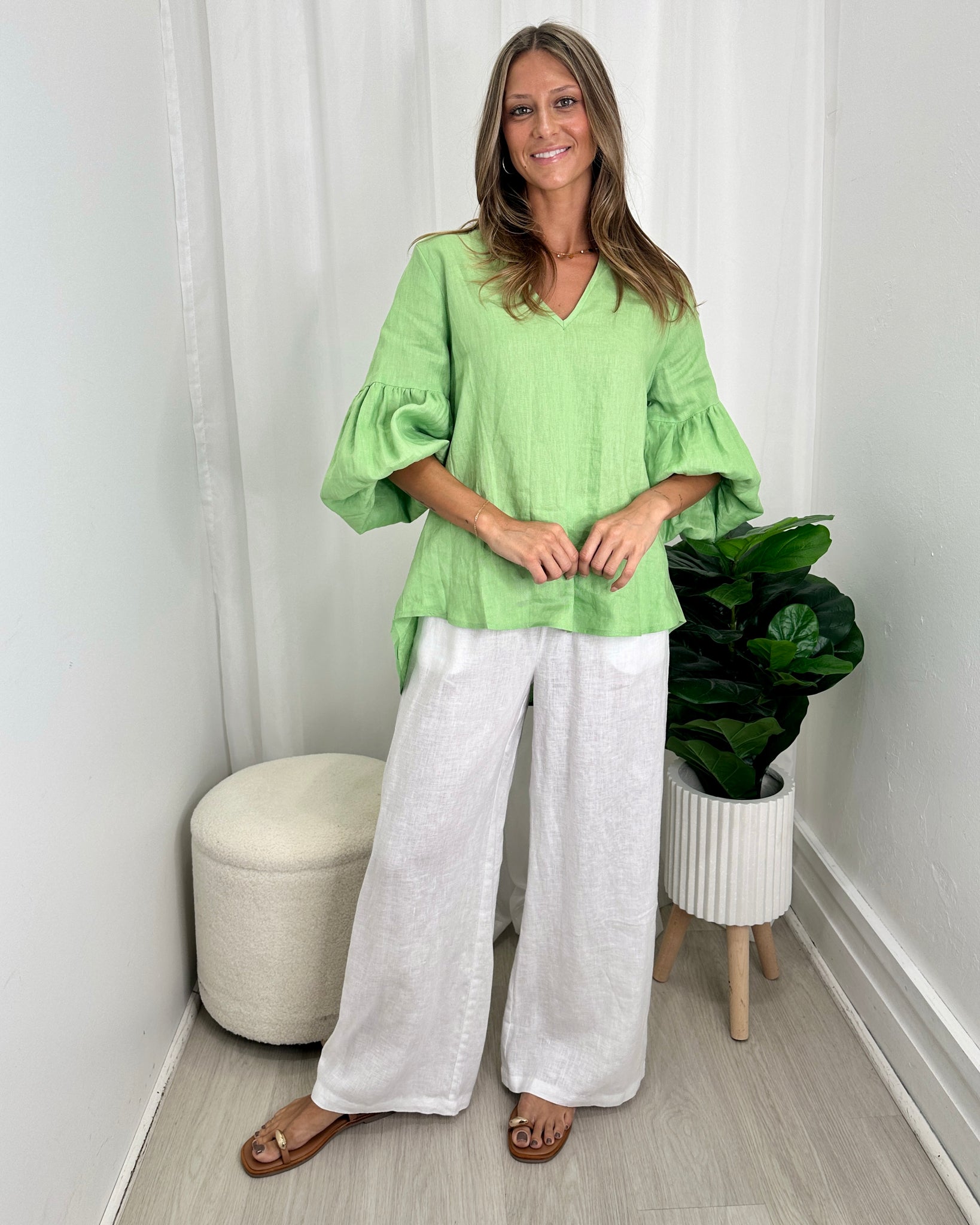 Fresh, effortless, and beautifully airy, the Annabella Linen Top by White Closet brings a soft pop of colour to your everyday dressing. Crafted from breathable pure linen, the statement puff sleeves add a touch of drama, while the subtle V-neck keeps the look refined and wearable. Pair with crisp white pants for a breezy daytime outfit.