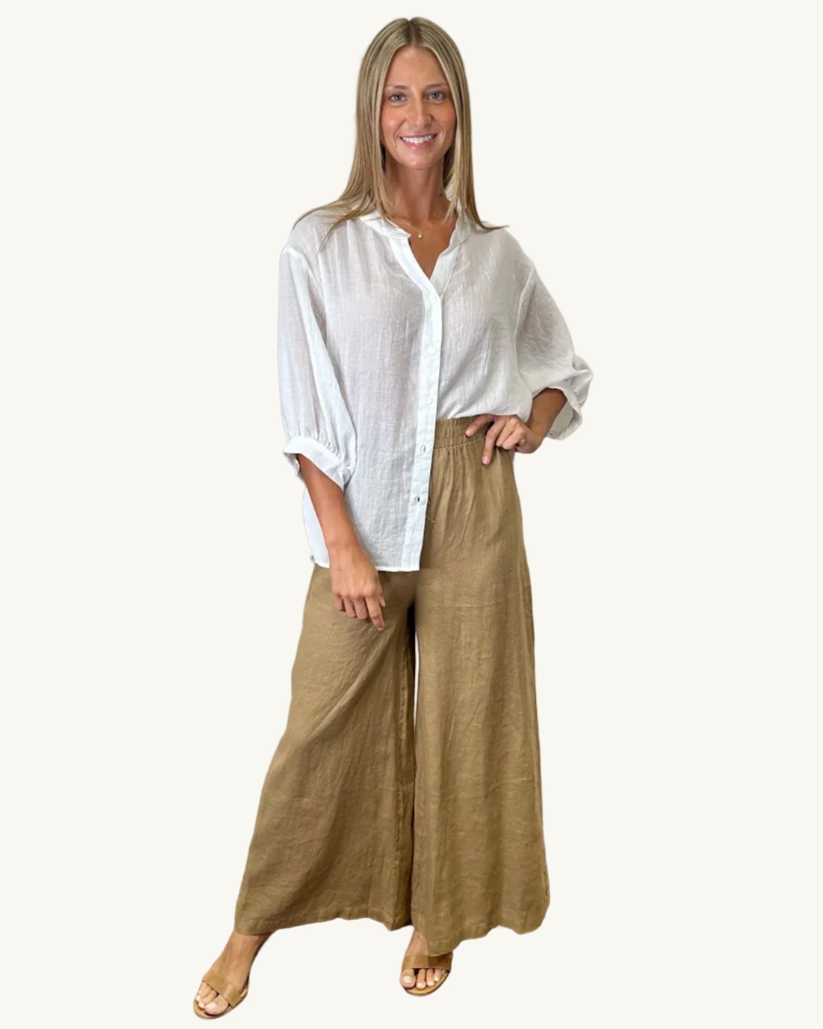 The Aria Linen Pants by Valeria The Label are chic, simple and are perfect for an understated everyday look. Style simply with anything from T shirts to blouses and sandals to heels for a versatile style.