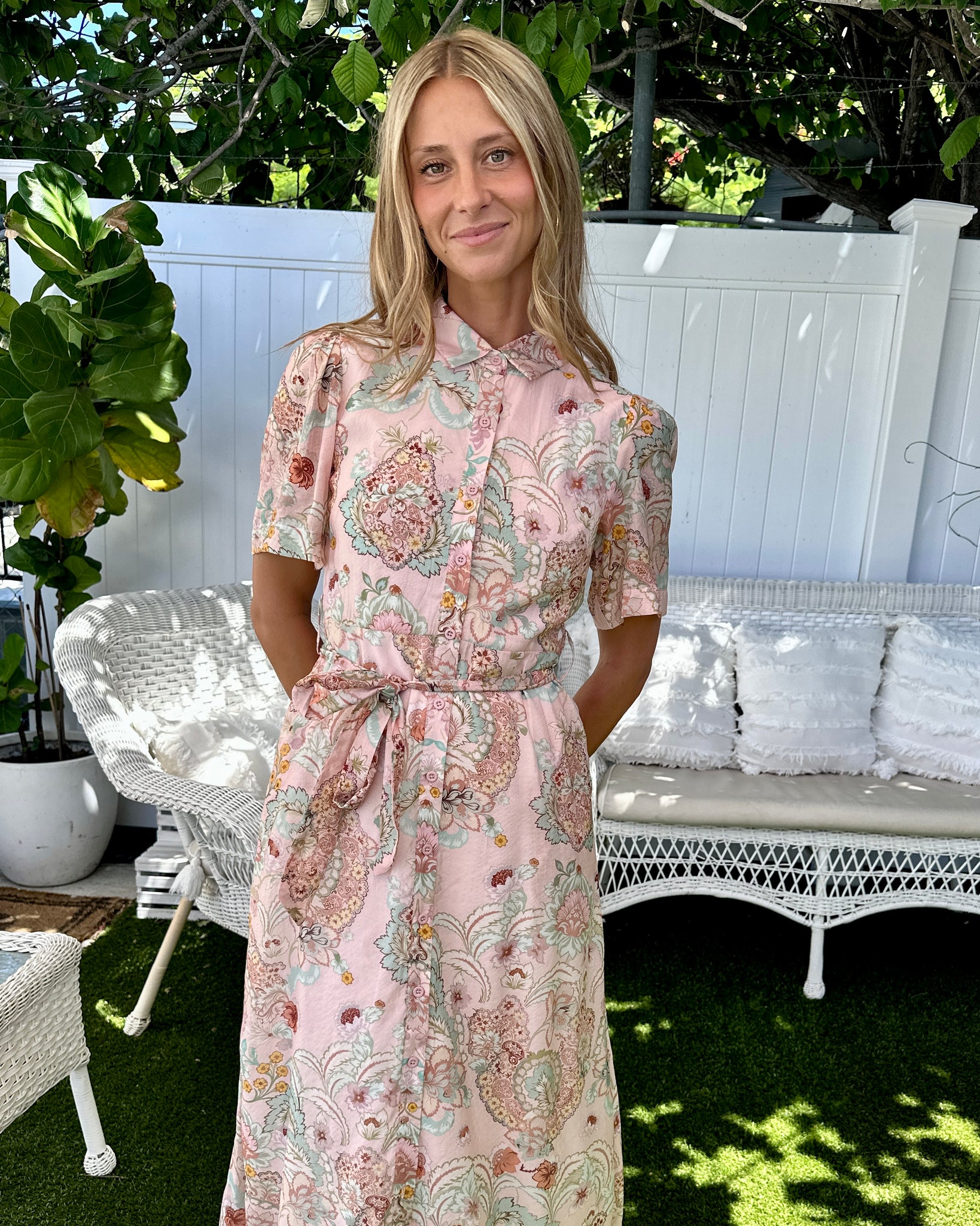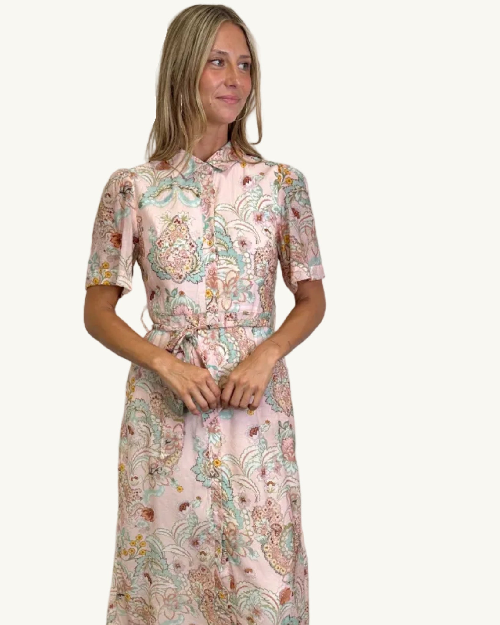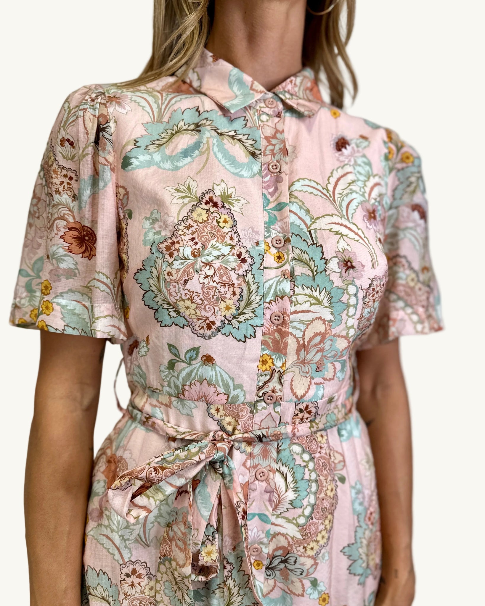 Designed with a classic shirt-dress structure, this dress features a neat collar, button-through front and a self-tie waist that cinches softly to flatter the figure. The midi length adds timeless appeal, while the short sleeves keep it light and wearable through the warmer months. Pair it with tan heels for events, slides for daytime ease or layer with a lightweight knit as the seasons shift.