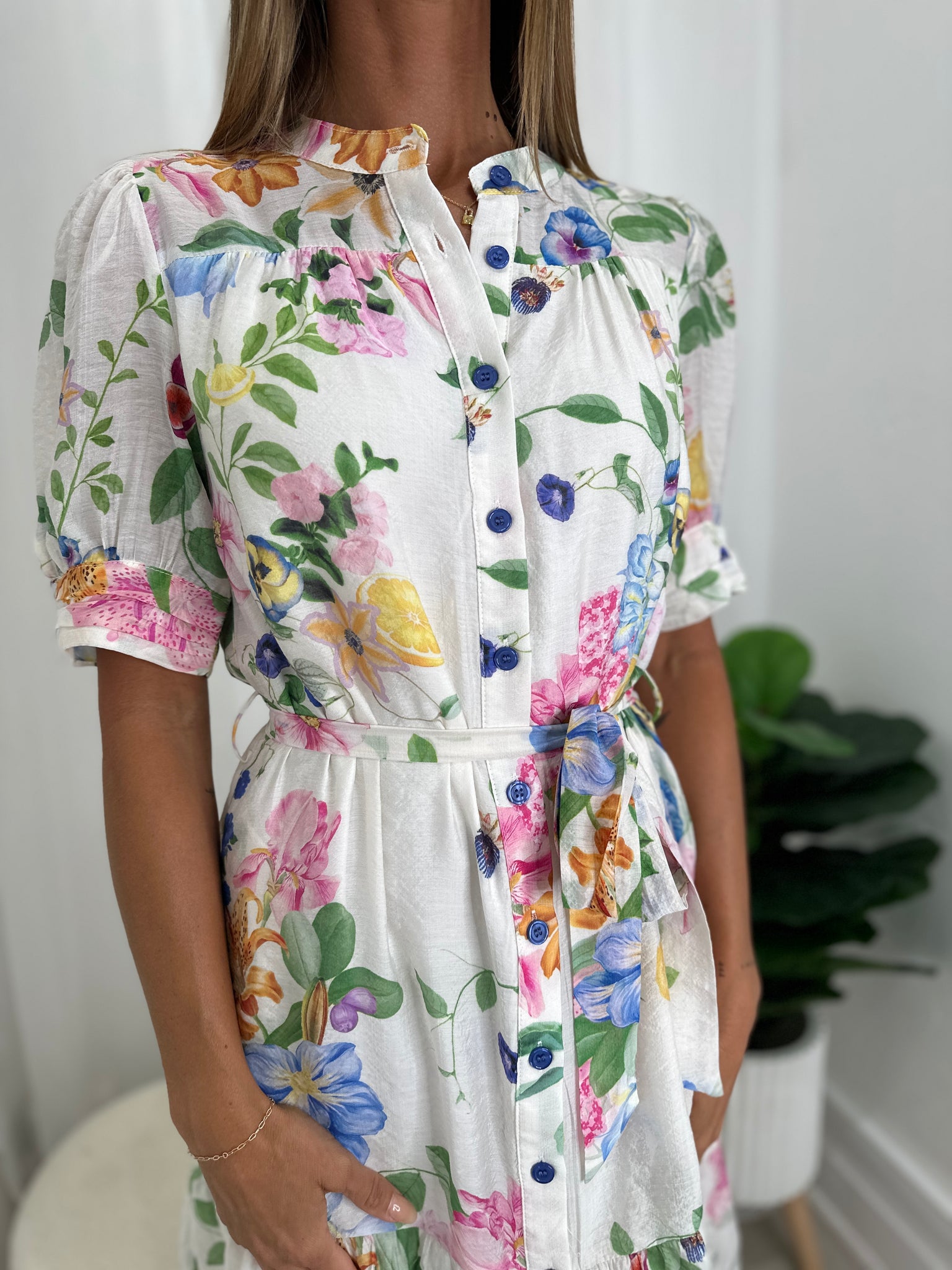 Bright, joyful and endlessly flattering — the Dusk Short Dress by Delilah brings fresh seasonal energy to your wardrobe. Crafted in a soft, lightweight fabric, this button-through mini features a vibrant botanical print that pops against its creamy base. The classic shirt-dress silhouette is elevated with a waist tie to shape your figure and rolled sleeves for an effortless daytime look.