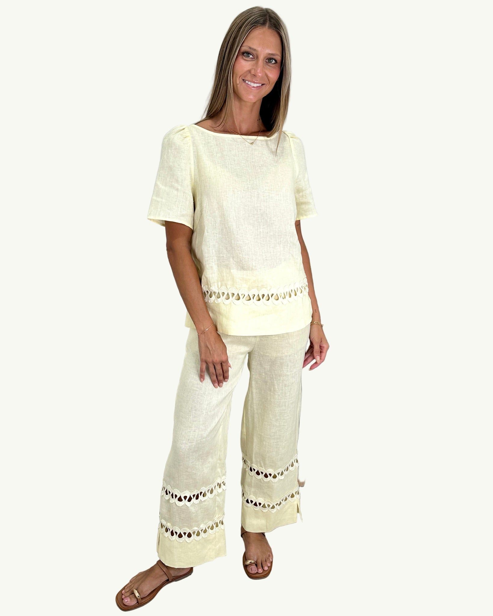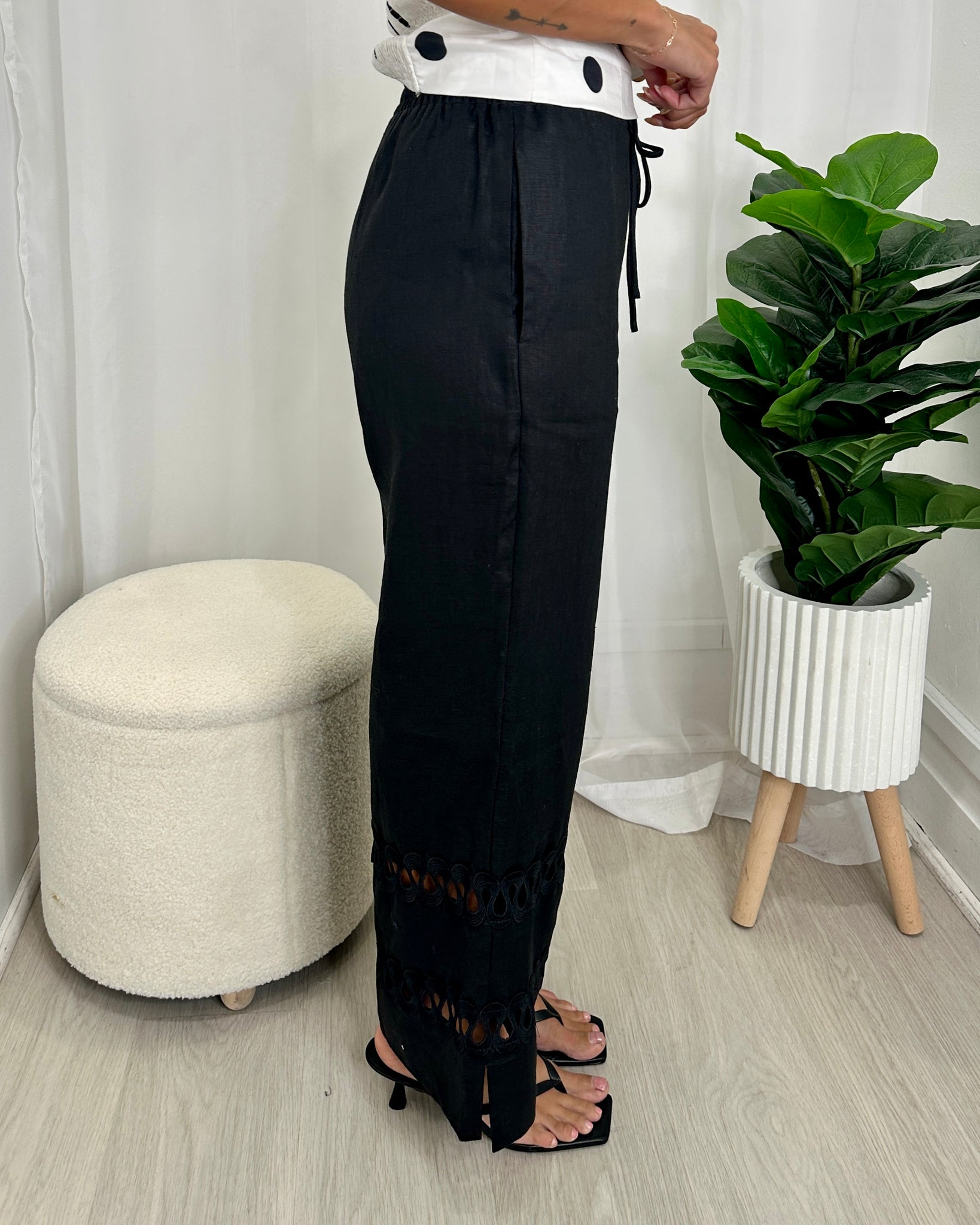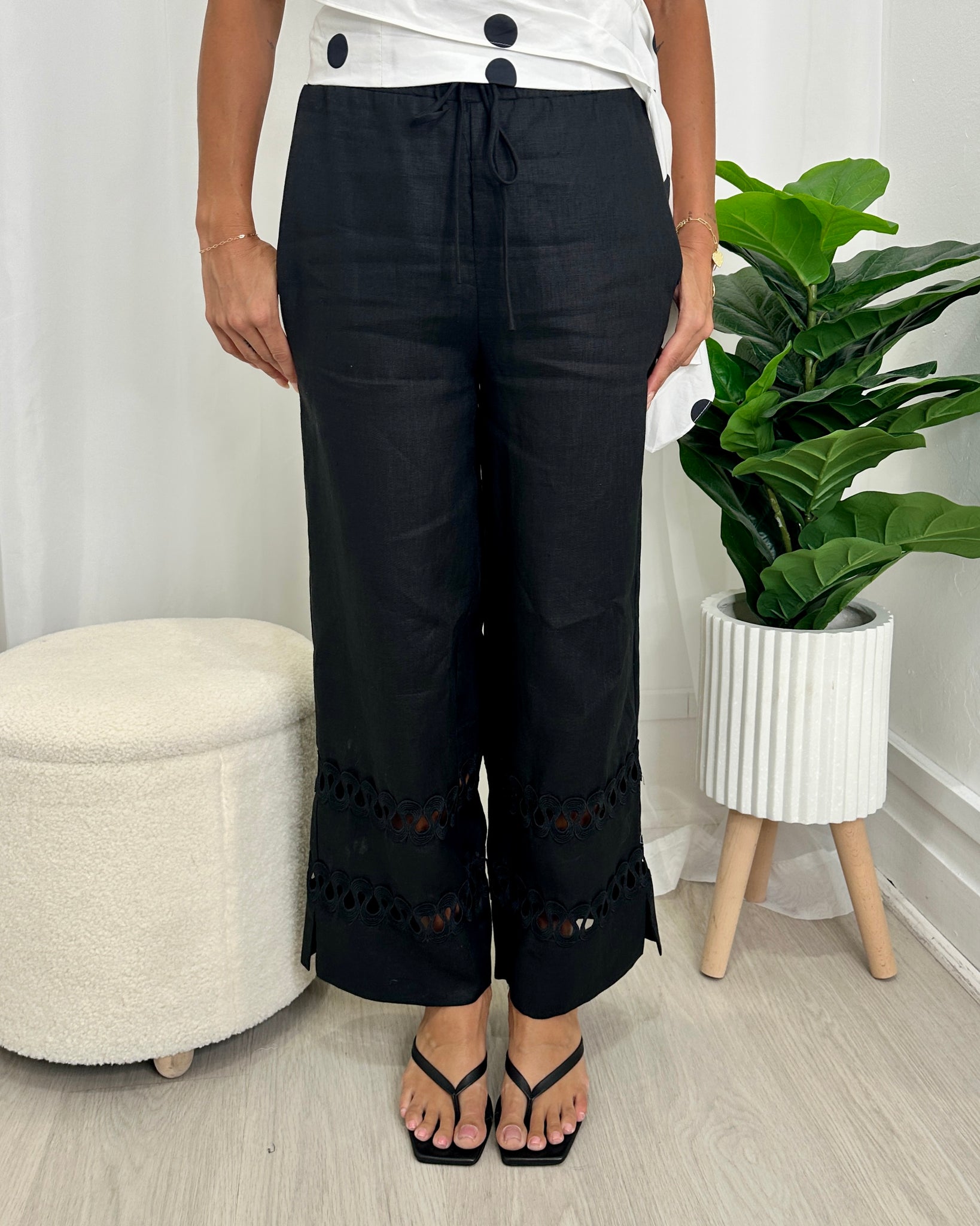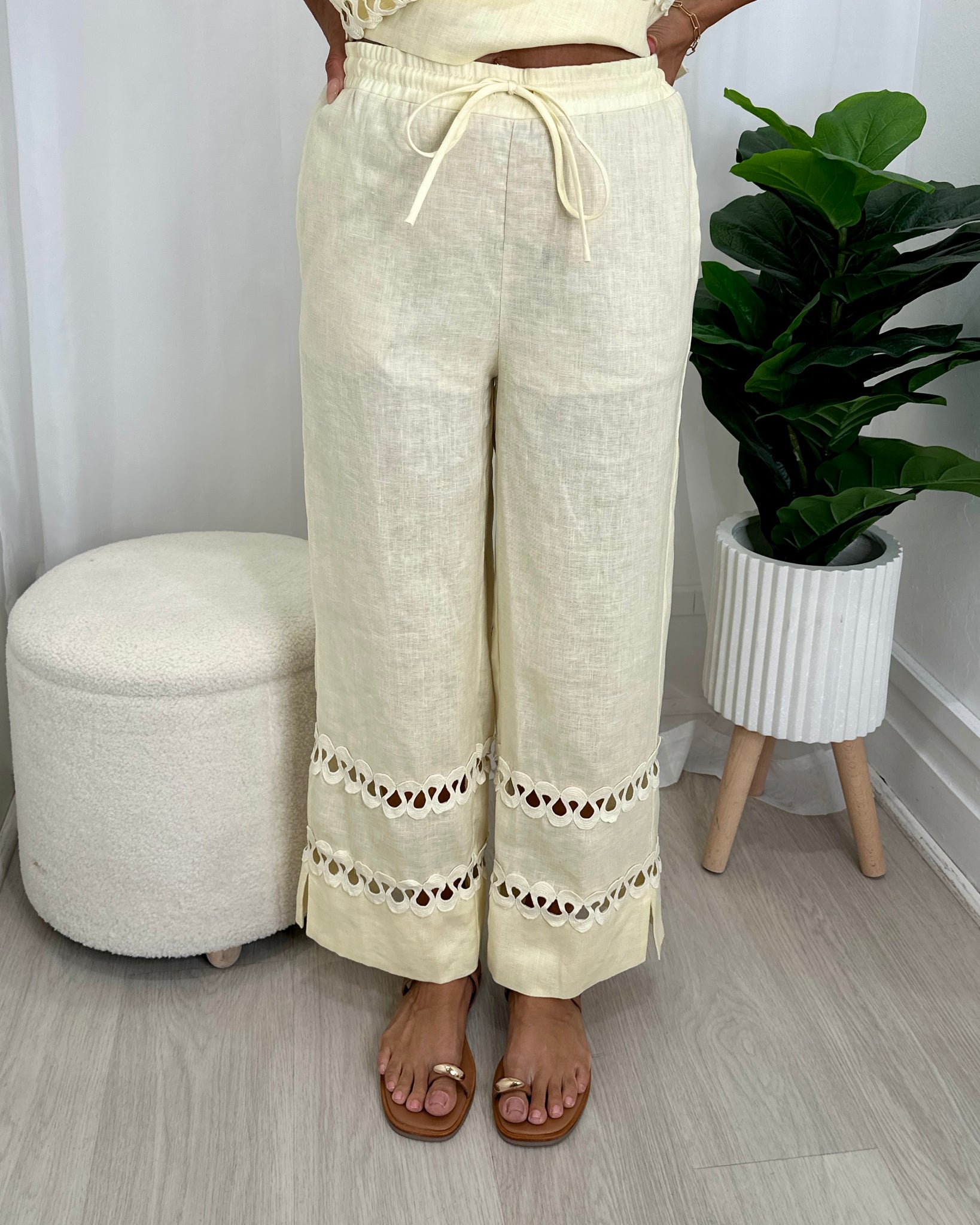 The Edith Ric Rac Trim Crop Pant by Adorne feature a wide-leg silhouette, cropped length, and ric rac detailing along the hem. Designed with an elasticated waistband and thin drawstring for a flexible fit, side pockets, and tonal lining for a clean finish.