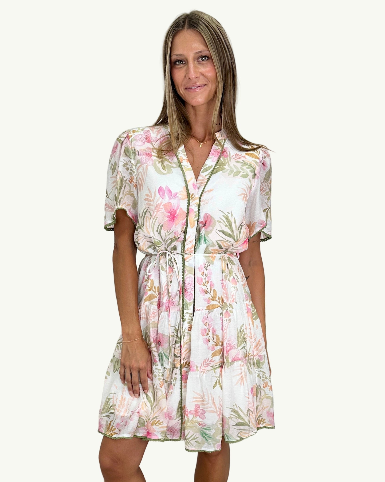 Soft, feminine and effortlessly pretty, the Shelby Short Dress by Delilah is the perfect throw-on piece for warm days and relaxed styling. Designed with a gentle floral print in shades of pink, peach and leafy greens, it brings a fresh, natural charm to your everyday wardrobe.