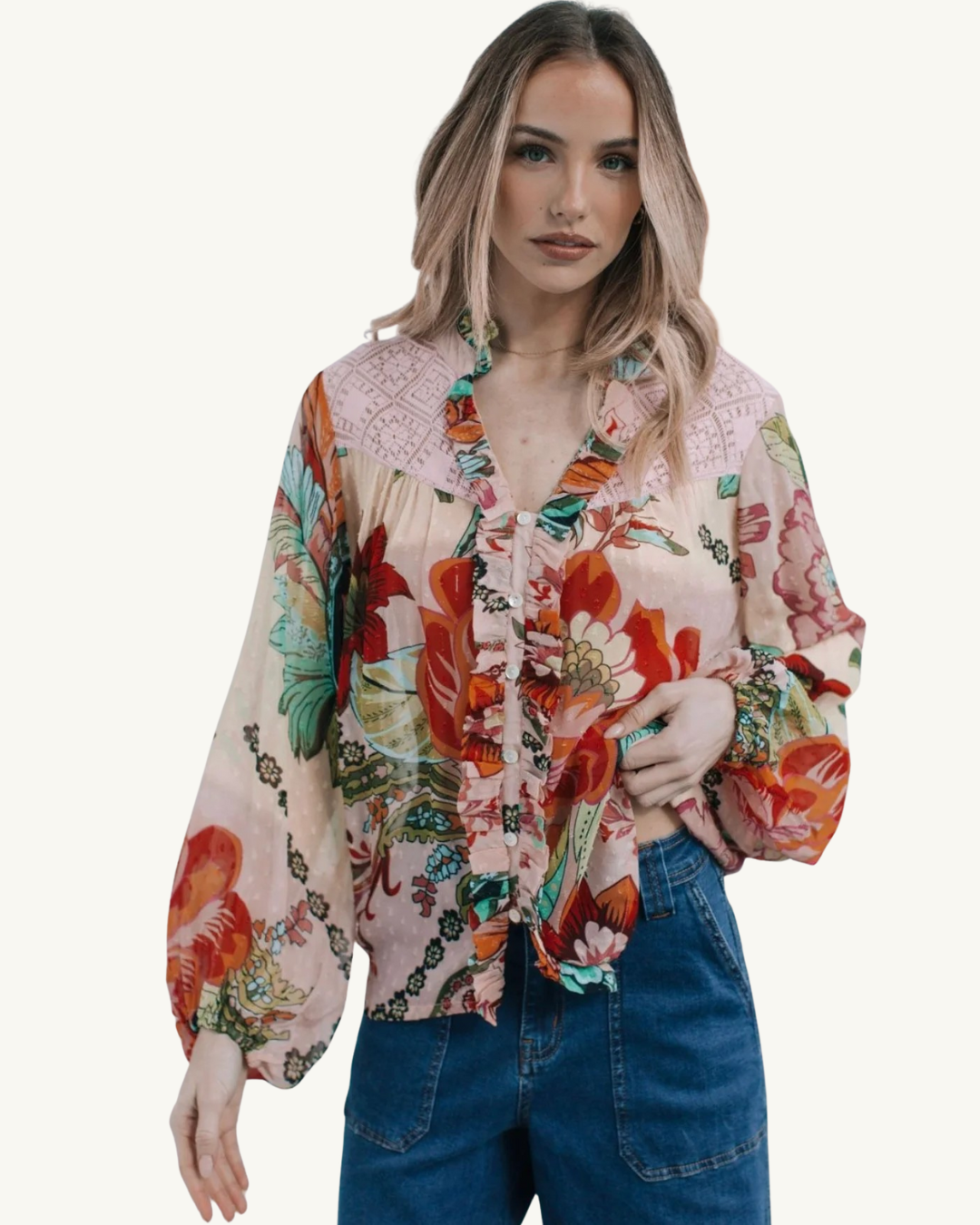 Bring a touch of effortless elegance to your wardrobe with the St Tropez Lace Blouse by Joop & Gypsy. This vibrant floral blouse is designed with a soft, feminine silhouette. Pair it with wide-leg denim for a chic casual look, or tuck it into tailored pants for elevated elegance.