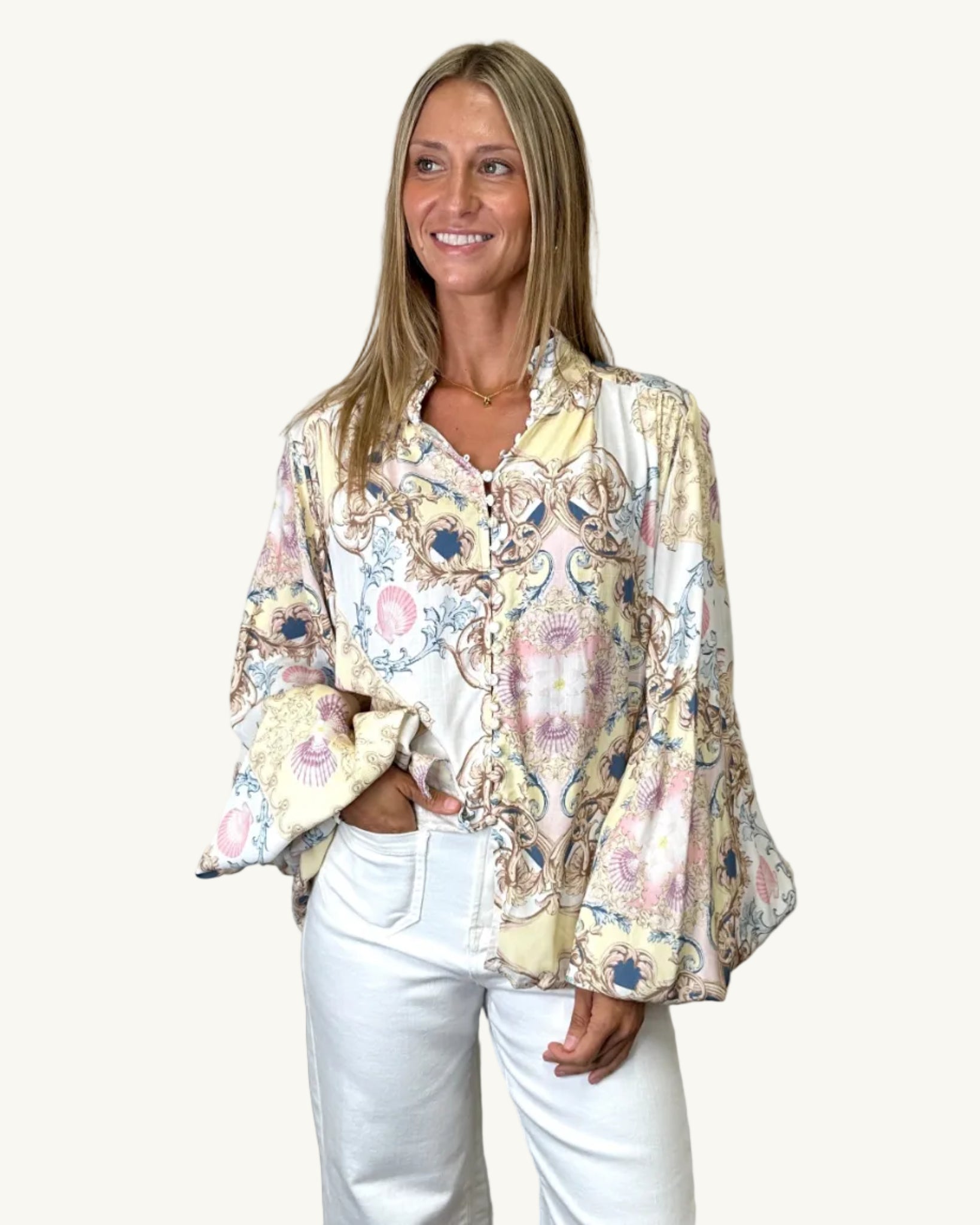 An elevated take on relaxed dressing, the Versailles Dreams Blouse by Jatea The Label blends soft romance with statement detail. Featuring an intricate coastal-inspired print in muted pastels, warm golds and soft blues, it feels like something discovered in a Mediterranean boutique — effortless, artful and quietly luxe.