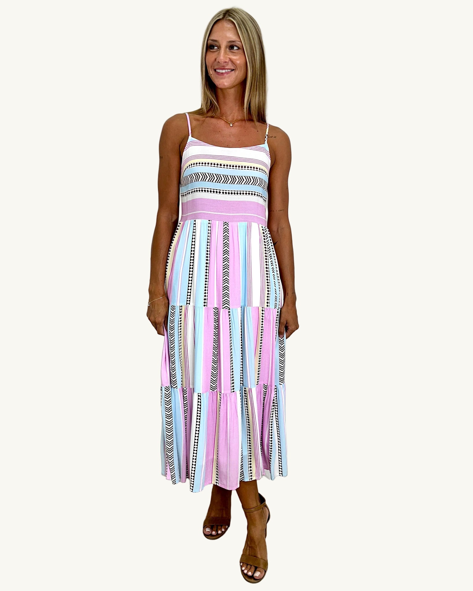 Playful yet polished, this striped Samuela Midi Dress by Harper & Me is designed to bring pastel coloured perfection to your everyday wardrobe. Featuring a straight neckline with slim adjustable straps, the bodice sits softly before falling into a tiered midi skirt that creates easy movement. The multi-colour stripe pattern adds a fresh, modern edge, perfect for warm days and relaxed occasions.