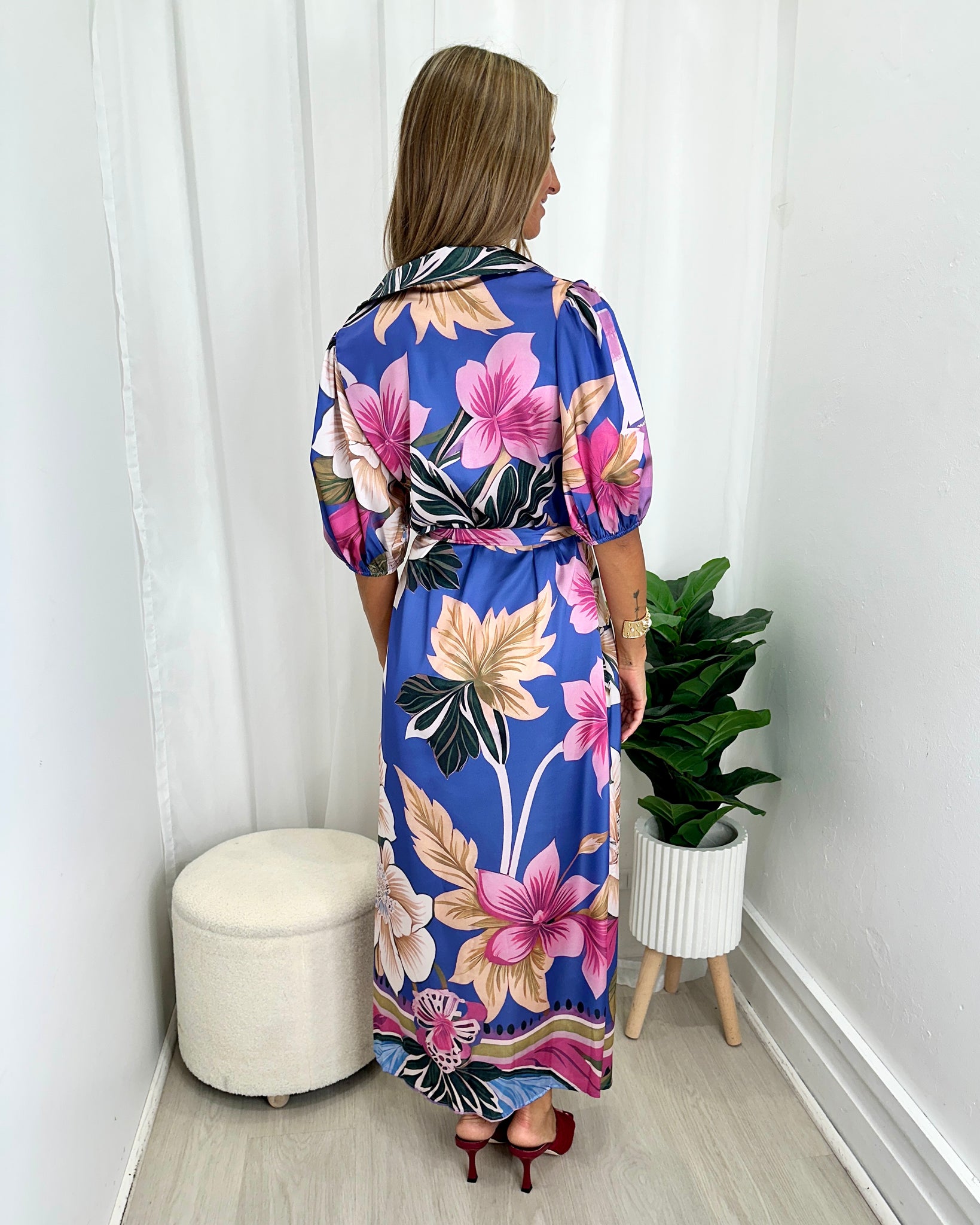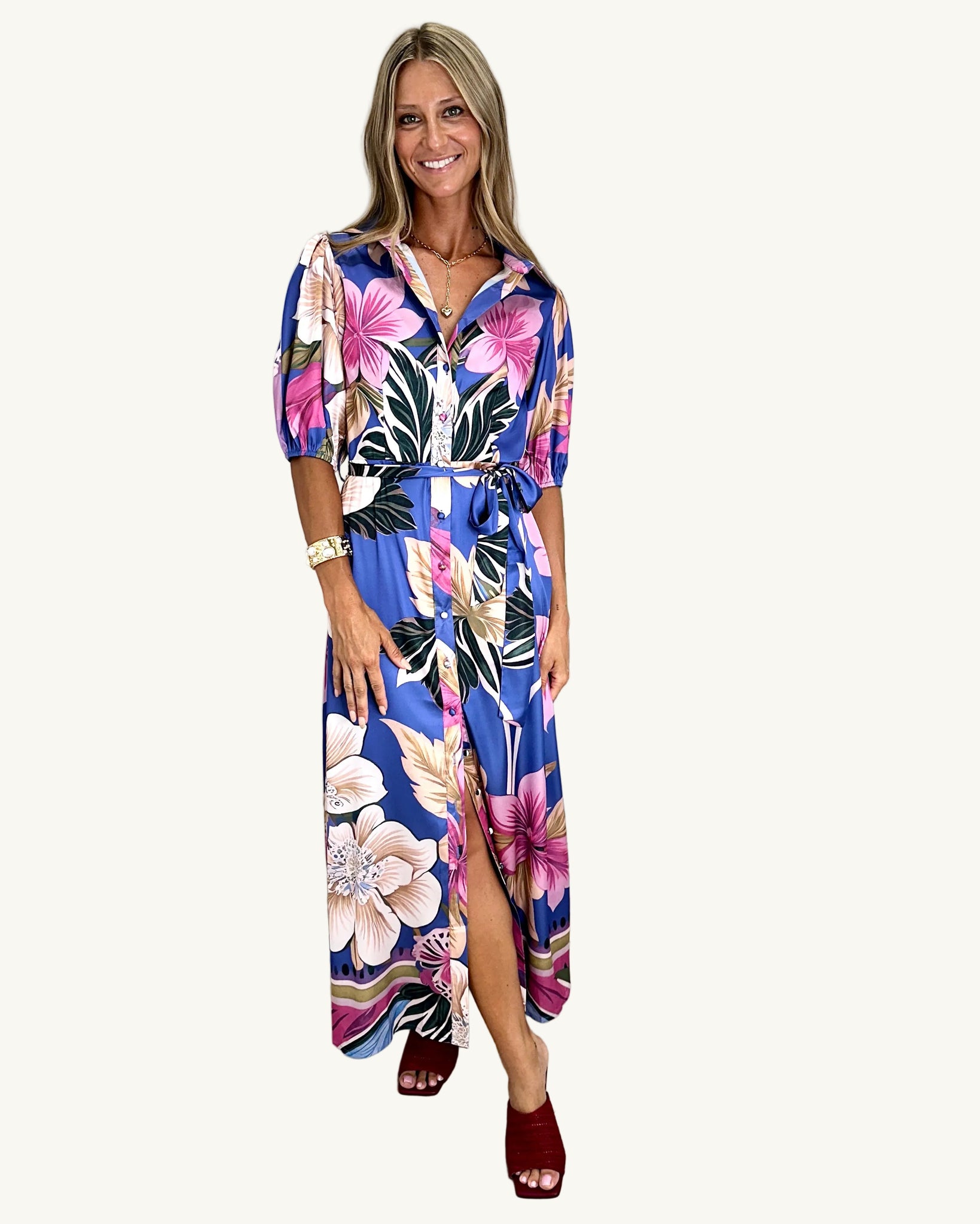 The Simona Shirt Dress by Pink Diamond is a luxe feel statement dress blends relaxed elegance with vibrant, resort-ready appeal. Featuring a striking floral print in rich jewel tones, this flowing maxi silhouette is designed with a soft collared neckline, elbow-length sleeves, and a self-tie waist to flatter the figure while offering all-day comfort.