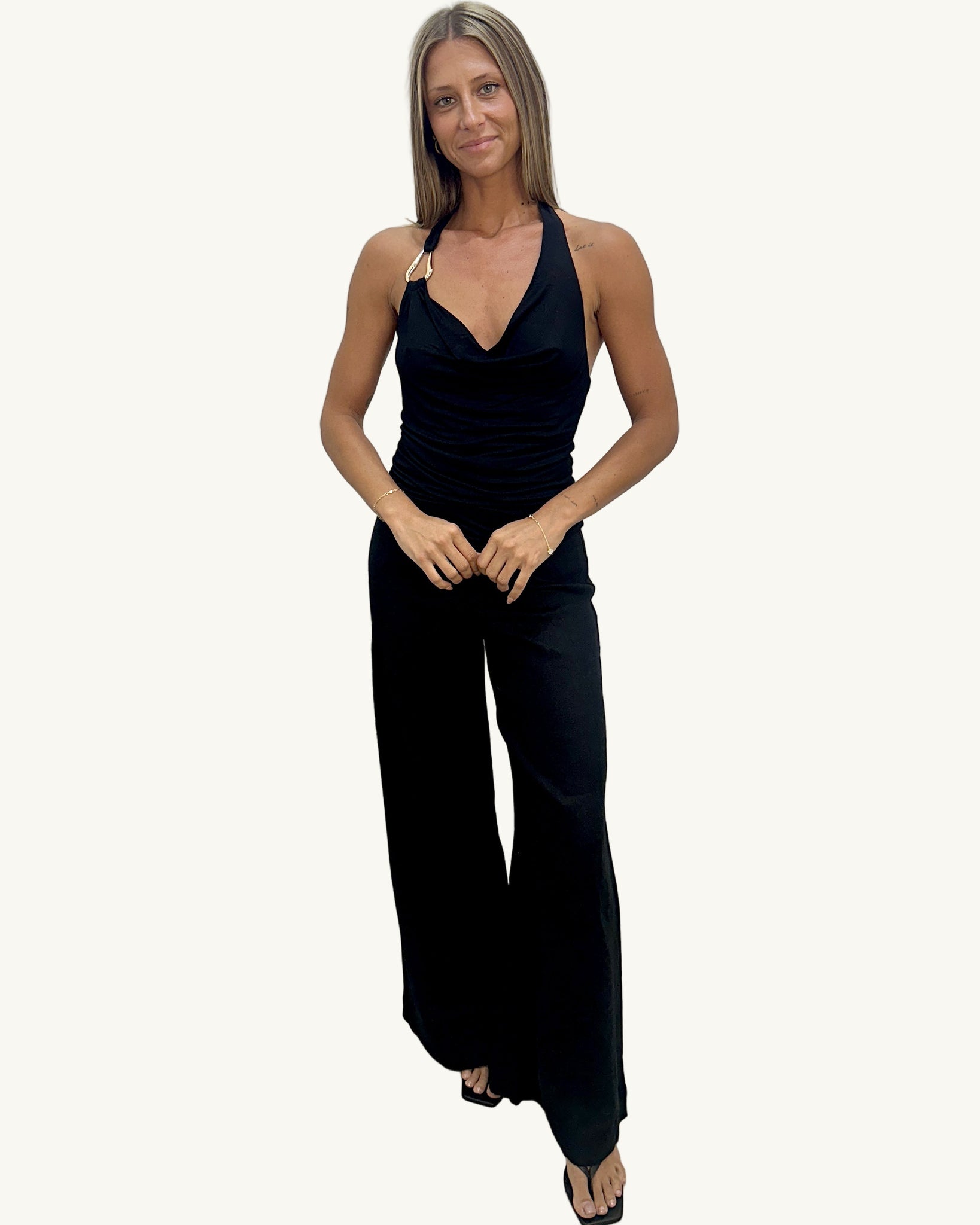 Chic and timeless, the Metallo Top by YH & Co is your go-to piece for effortlessly elevated style. Crafted in a soft stretch fabric that drapes beautifully over the body, this top features a cowl neckline and a halter strap finished with a statement gold ring detail for a touch of modern glam.
