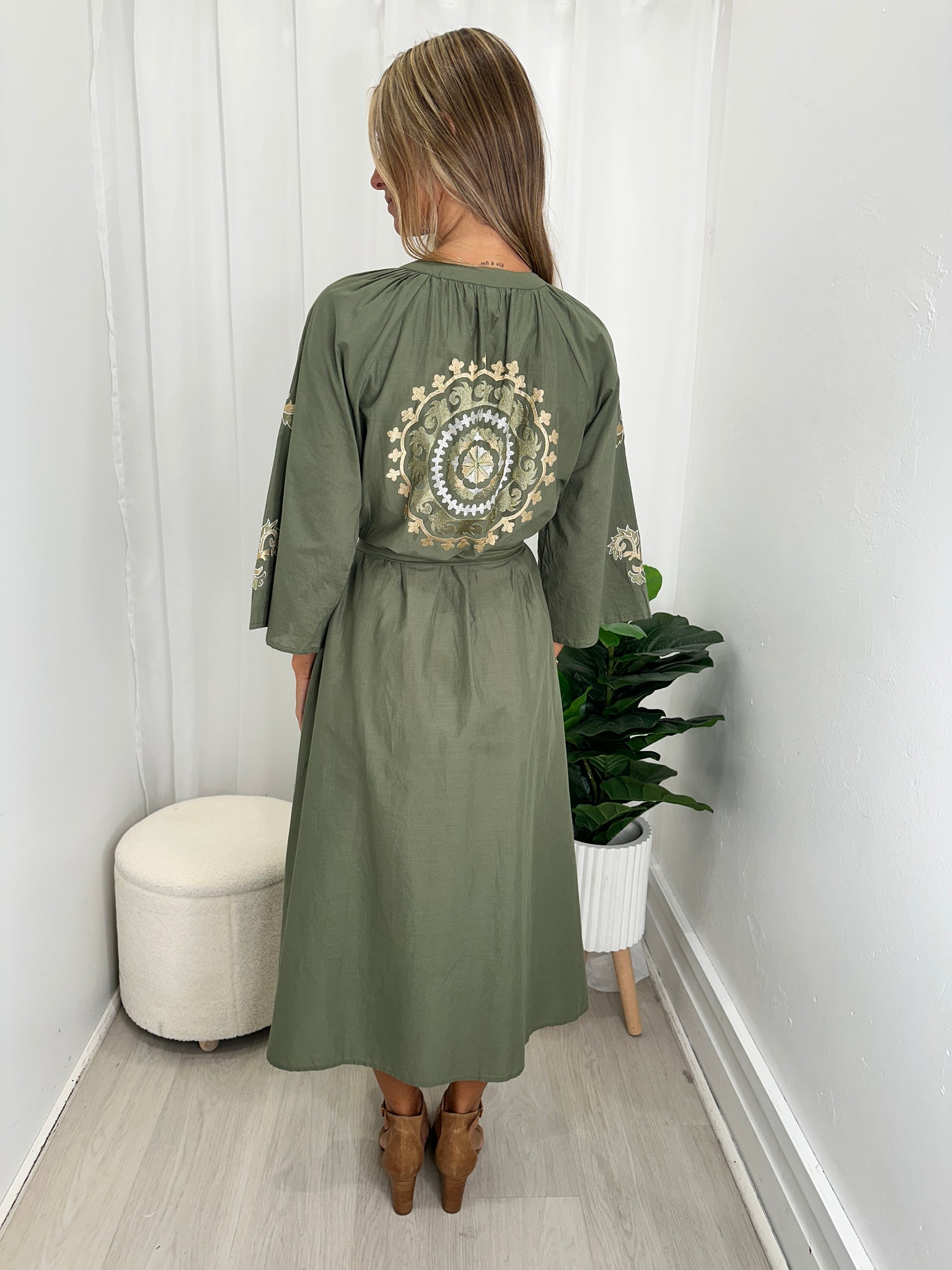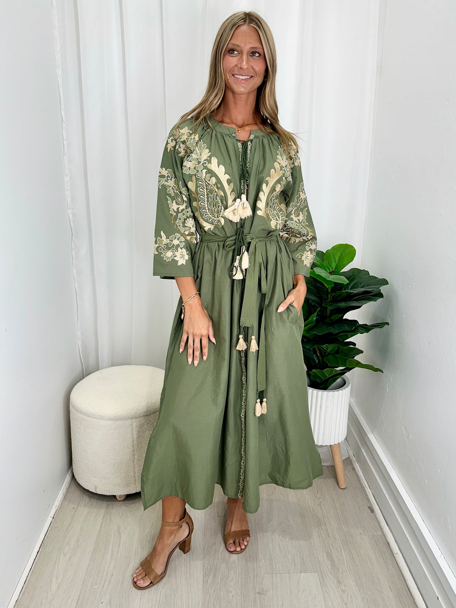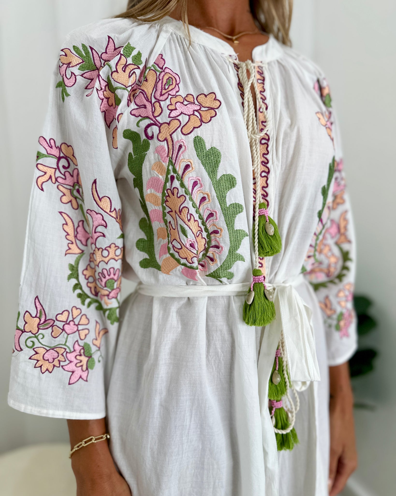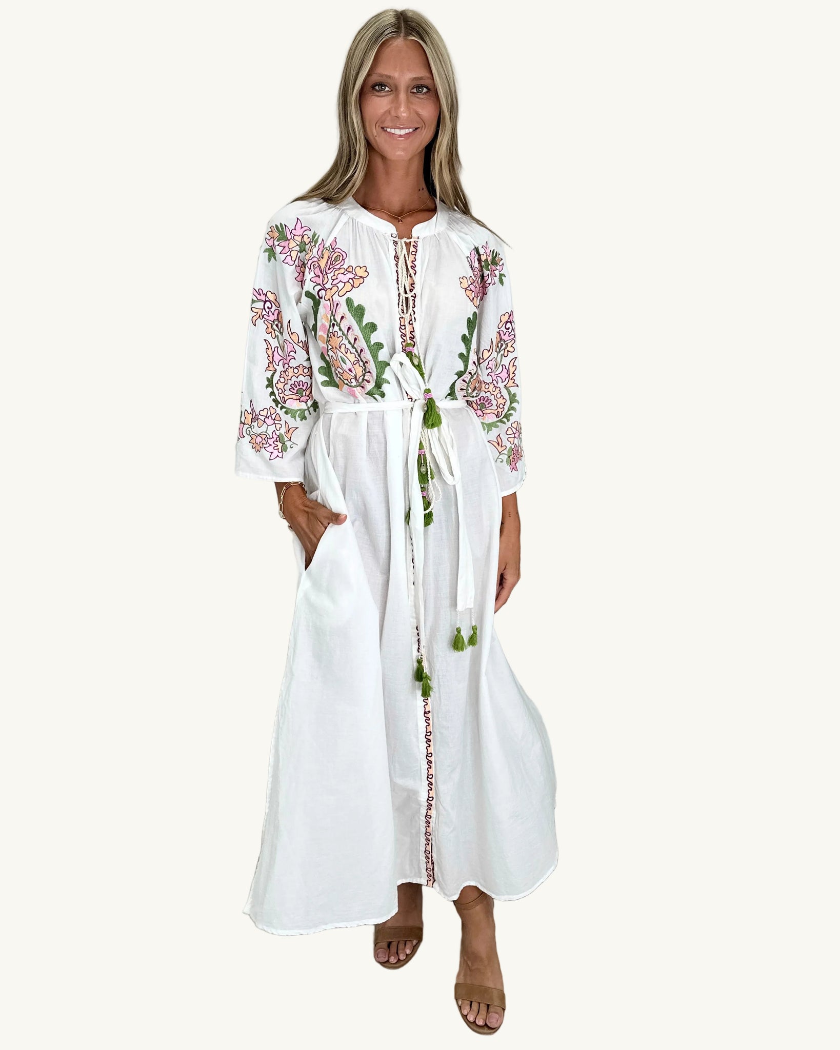 The Tori Embroidered Wrap Dress by PALME is a beautifully detailed statement piece, blending effortless comfort with vibrant embroidered charm. Featuring a soft white base adorned with pink and green floral embroidery, it offers an elevated boho-inspired feel perfect for warm days, holidays, and relaxed summer events. The tassel-tie neckline and matching waist tie allow you to shape the silhouette while keeping the look easy and breezy.