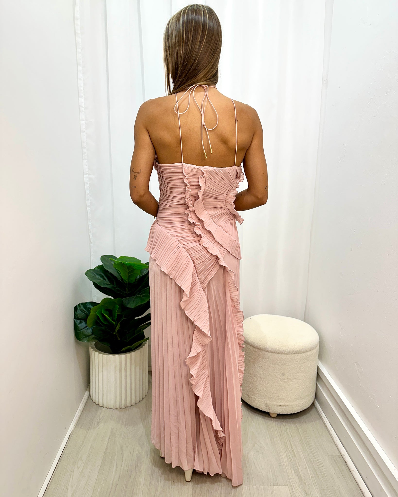 Turn heads in the Emelie Pleated Maxi Dress! Romantic ruffles and soft blush tones make this halter maxi a standout choice for weddings, soirées, and every elegant occasion in between.